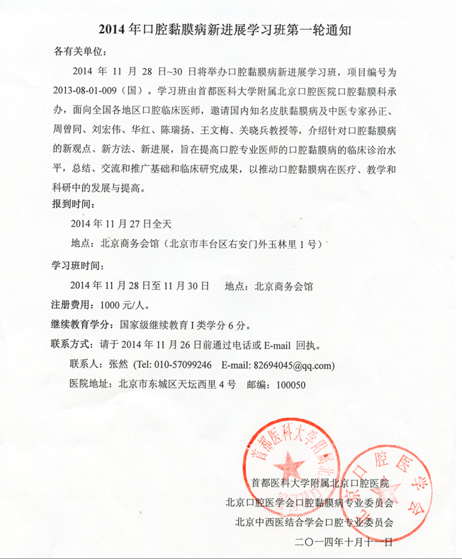 2014年口腔黏膜病新进展学习班第一轮通知