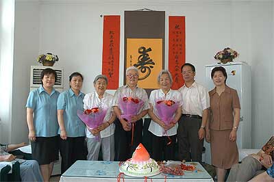 由离休党支部书记陈琳老伴手书的寿图和寿联为会场增添了浓墨重彩的一笔。擅长绘画的马毓华大夫向老寿星们献上了“寿而康”的水墨画,她说:“我们离休干部中最小的也是74岁的老人了,今后不论是谁过80岁生日,我都要以画相赠。”这话令所有的同志感动,大家深有感触地说:“我们虽然年事已高,但看到了改革开放以来祖国发生的翻天覆地的变化以及欣欣向荣的景向,这是我们最大的幸福。同时我们也深深感谢离休党支部这个集体,在这个集体中大家老有所学、老有所为,保持着共产党员的朝气和情怀。我们之所以健康长寿,有的身患重病却带病延年,一个重要的原因是有离休党支部这个温暖的集体,以及医院领导、离退办的关心和照顾。”