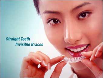 无托槽矫治器(隐形牙箍):矫治时口内无需安装任何金属和钢丝,而是由正畸医生为患者度身定做一套(十几个到几十个)无色透明的“牙箍”,按顺序约每两周可自行更换一副“牙箍”,牙齿会慢慢地排列整齐,由于没有了复杂的矫治托槽和钢丝,所以避免了对口腔的创伤刺激;由于“隐形牙箍”可以自行随意取下,所以不会影响日常饮食和口腔卫生,由于患者可以自行更换“牙箍”,所以不必频繁的到医院复诊,因而节省了大量的时间;由于“牙箍”是由无色透明的树脂模压制作,紧密的贴附在牙齿上,还可以随时自行取下,所以在矫治中对外观几乎没有任何影响。