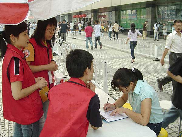 2006年10月1日下午,我院志愿者协会派出我院特诊科护士武梅、刘晶,综合科护士刘琪和北京口腔医院志愿者协会工作人员苗聪聪等4名志愿者参加了中关村海龙大厦门前的街头采血车的无偿服务工作。此举主要是宣传无偿鲜血工作,同时协助北京红十字血液中心为义务鲜血者进行服务。