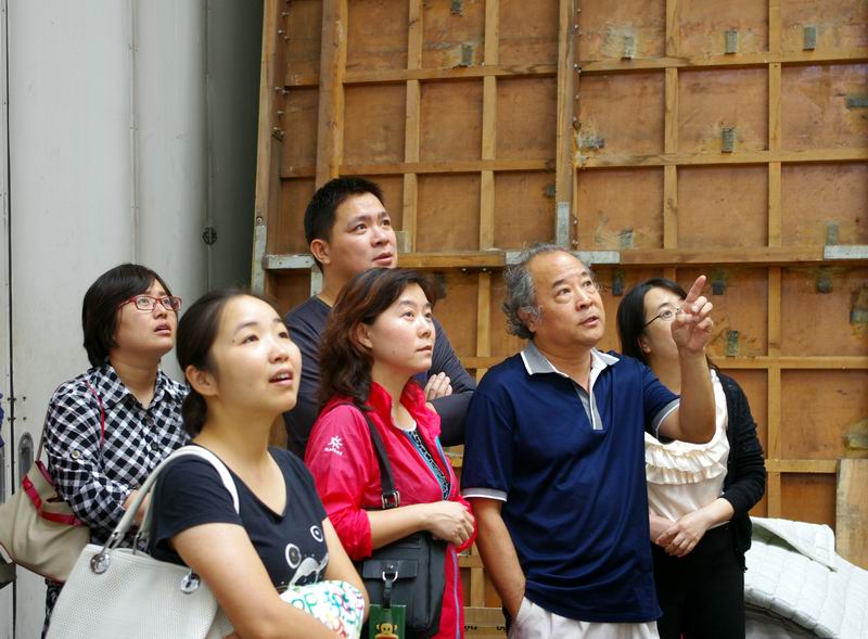 葛小光热情地接待了我们。走进他设在在天安门城楼的西北角的画室,一幅尚未完成的巨幅毛主席画像和孙中山画像呈现在眼前。这间画室是一座面积为90平方米,高8米多的铁棚子。以铁皮为材料搭棚主要是为了防火,顶部由半透明玻璃铺就,是为了让阳光从顶部均匀地透射进来。他首先向大家介绍了主席画像的基本情况。画像高6米,宽4.6米,加上像框,总重量达1.5吨,这是在全国、亚洲甚至在东半球,也是最大的手工绘制的肖像。