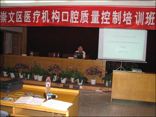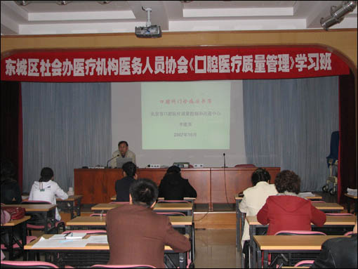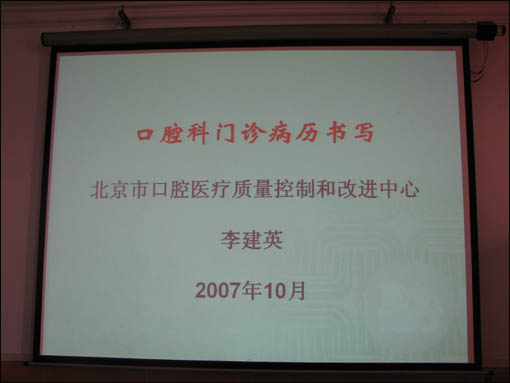 “中心”于2007年7月至11月分别在崇文、密云、昌平、延庆、西城、东城六个区县开展了为期一天的学习班,“中心”专家到区县去培训的这种方式,从交通便利、费用节约等方面都便于学员参与,大大提高了培训的普及率。六次培训,参加机构共计219家,参加人员共计384人。“中心”专家对《评估办法》,尤其对口腔各科病历书写和病历管理规范和口腔诊疗过程中的感染控制规范,以多媒体讲稿和示范光盘方式进行讲解。学员普遍反映授课内容直观,清楚,很有收获。