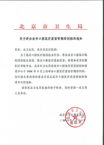 北京市口腔医疗质量控制和改进中心于2006年9月和10月在北京市卫生局市委党校举办了两期口腔医疗质量管理培训班,共有381个口腔医疗机构,共计422人参加, 18区、县卫生局医政科同志、卫生监督所同志也参加了此次培训班。