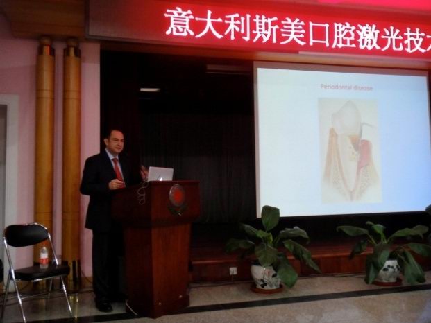 由我院牙周科主办、北京同心行公司协办的意大利斯美(Doctor Smile)激光技术交流讲座于11月26日在多功能厅成功举办。来自北京多家医院和天津、济南等外地医院约200多口腔同仁参加了本次讲座。本次讲座的主讲人是来自意大利热那亚大学的Benedicenti教授。Benedicenti教授就激光治疗的原理、激光在口腔各个专业的应用和注意事项进行了详细的介绍。现场气氛热烈, 观众对讲座内容展现出浓厚的兴趣,对于激光治疗的安全性、有效性和远期效果等共同关心的问题进行了提问。30位观众在厂家的指导下,亲身操作了由意大利LAMBDA(蓝达)公司提供的口腔激光治疗设备。此次讲座的成功举办增进了口腔医务工作者的交流,使大家进一步了解了激光在口腔疾病治疗中的作用。