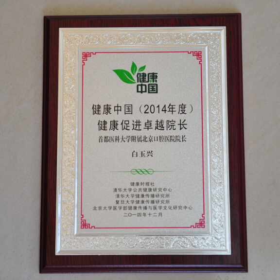 2014年12月26日,第七届“健康中国”论坛活动举办,北京口腔医院白玉兴院长荣获“健康促进卓越院长奖”。