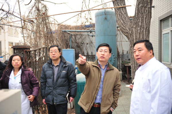 在配电室、气泵房、锅炉房,院领导一行查看了设备运行情况,询问春节期间值班人员配备情况,叮嘱当班人员不脱岗,不喝酒,注意安全。为避免气泵房小院内的正压罐因受外力出现危险,建议加固防护栏、水泥墩以防止汽车等冲撞,保证医疗设备的正常运行。