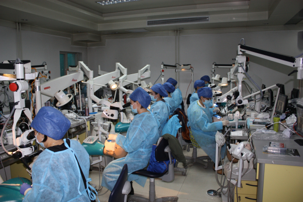 参加实战操作演练的学员共25名,在为期两天的操作学习中,医院为学员们提供了精确的教学模型,先进的设备及器械,由侯本祥教授,张琛副教授和李红副主任作为操作指导老师,进行了橡皮樟隔离技术、显微镜的使用方法和常见错误、超声根管器械的使用、显微镜下遗漏根管的寻找、根管分离器械的处理及显微根尖手术等高新技术的演示和操作练习,让学员在规范的理论指导下更直观的了解每一个操作细节。在操作练习时,各位老师认真巡视学员们的练习情况并及时纠正错误,及时解答学员所遇到的各种问题,尽力让每一位学员都能掌握各项操作技能。