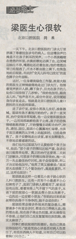 进了诊疗室,安排小男孩儿坐好、准备器械,梁颂有条不紊地开始治疗。孩子一直哭闹,治疗变得异常艰难,他一边安慰和鼓励孩子,一边用局部麻醉给孩子止疼。孩子的恐惧情绪渐渐消除了,开始慢慢主动配合治疗。冲洗、清创、固位,梁颂小心翼翼地忙碌着,当孩子面目清爽的从牙椅上站起来时,已经是傍晚了。孩子安静地走出诊室,家长如释重负,不停地说着感谢的话。