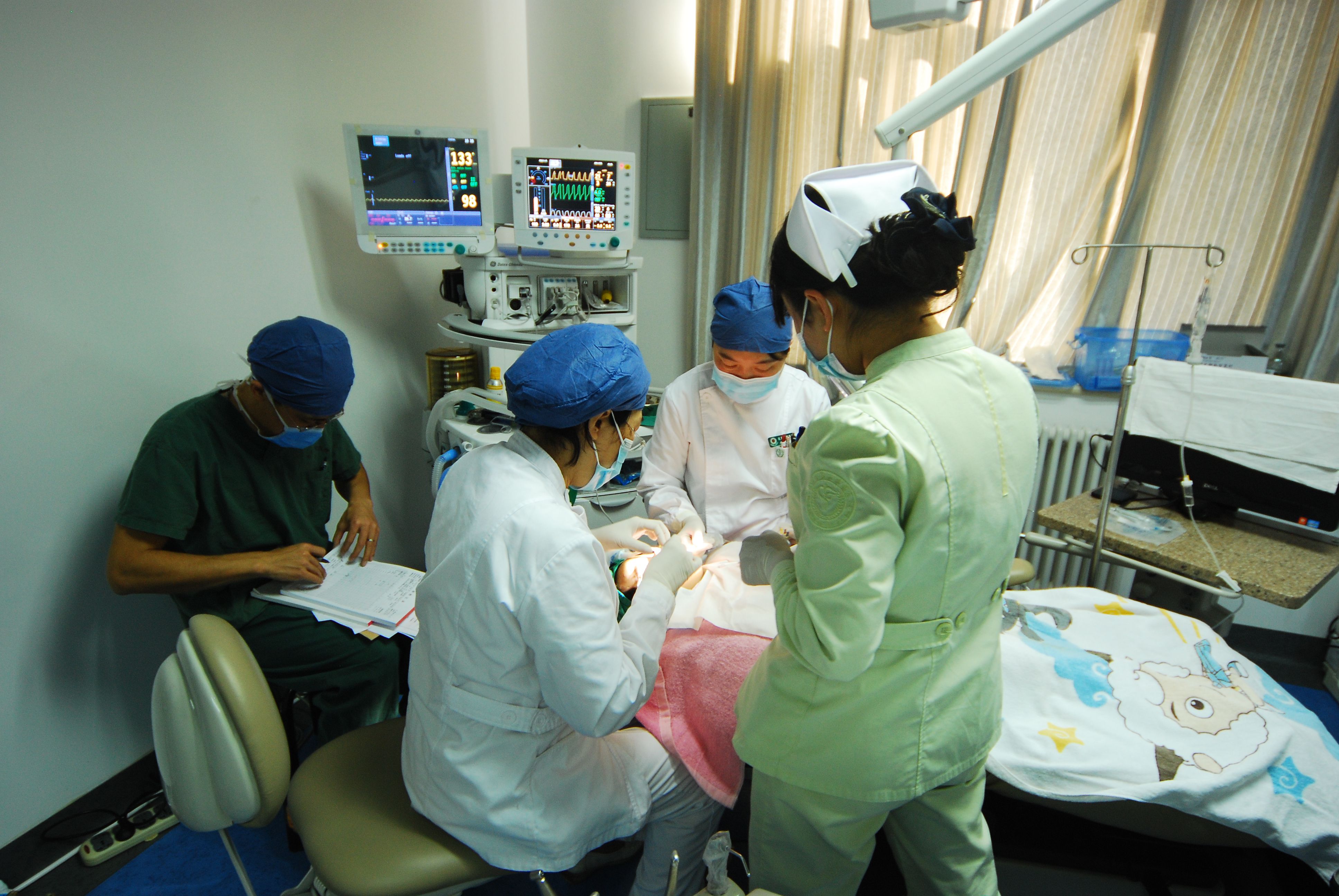 全麻下儿童牙病的治疗是患儿在专业的麻醉师监护下,通过鼻气管加静脉复合麻醉,一次性的完成口内所有的牙齿治疗。治疗的过程没有疼痛和哭闹挣扎,这种治疗方法保护了患儿的身心健康,保证了治疗质量,还大大减少了就诊的次数和家长的精神负担,治疗效果得到了患儿及家长们的肯定。从2013年底, 北京口腔医院儿童口腔科在麻醉科和特诊科的全力协助下开展了全麻下的儿童龋齿的治疗。自全麻下儿童牙病治疗开展以来共治疗患儿20余例,平均年龄3岁左右,病例均为多颗牙齿的治疗,内容涵盖龋坏充填修复,根管治疗,活髓切断,窝沟封闭,拔牙以及牙齿的涂氟治疗等,一次治疗时长2-4小时。