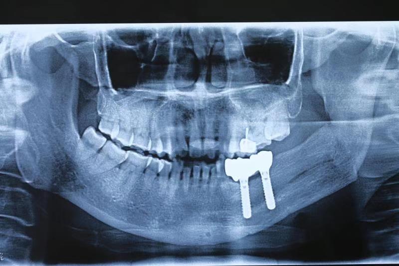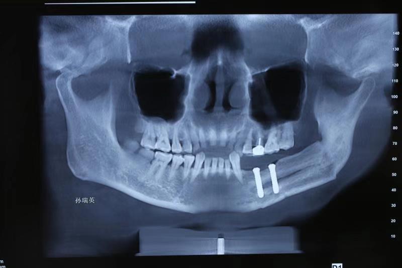 二、针对肿瘤、创伤治疗术后的复杂颌骨、牙列以及软组织缺损,采用种植技术联合骨移植进行功能性重建,尽最大程度恢复患者的咀嚼、发音以及吞咽等口腔功能,提高患者生存质量。(图为下颌骨区段缺损游离腓骨肌皮瓣移植术后行牵引成骨,二期种植行种植修复。