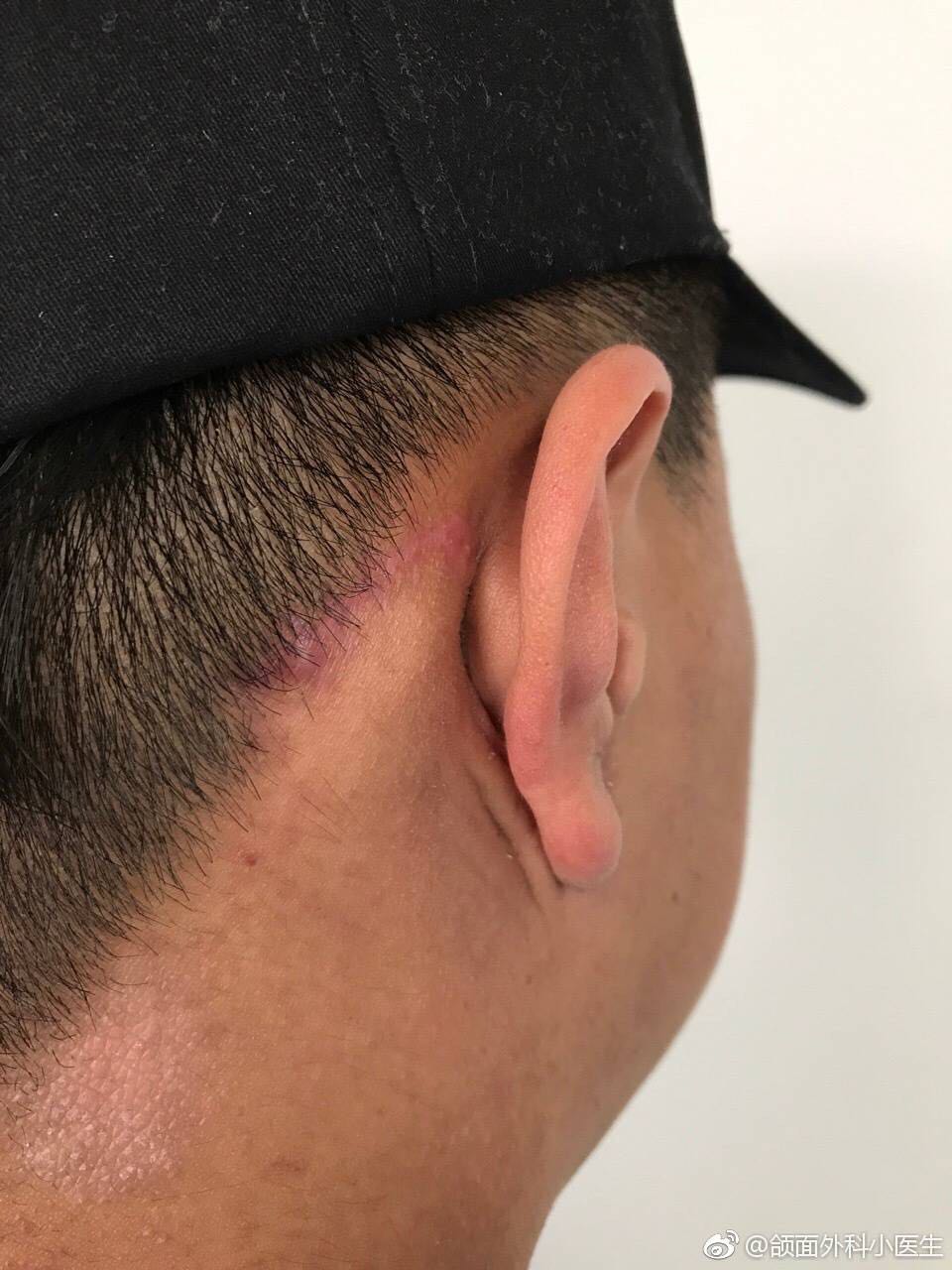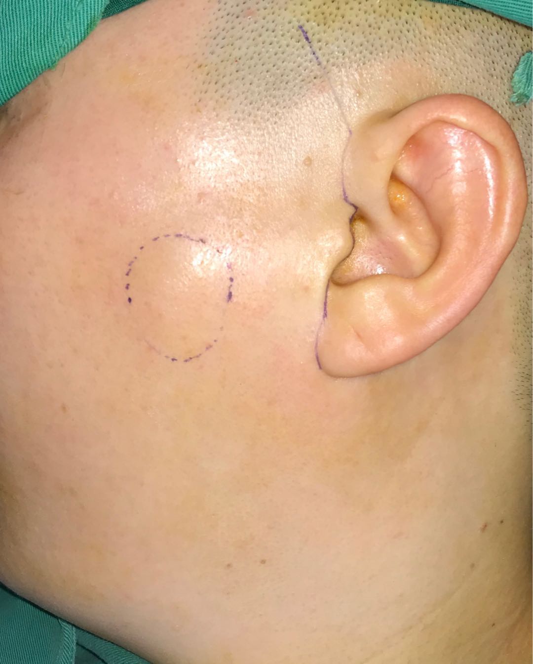 三、良性肿瘤的微创治疗。科室内倡导针对良性肿瘤的治疗方针,在充分治疗疾病的基础上更加关注患者患病区域功能结构的保存,强调切口设计的美观隐蔽。其中特色治疗项目包括1.大型颌骨囊性病变的开窗治疗。2.青少年实性/多囊型成釉细胞瘤的清淤治疗。3.腮腺美容切口在治疗各类腮腺肿瘤中的应用。(图示为发际内切口设计)