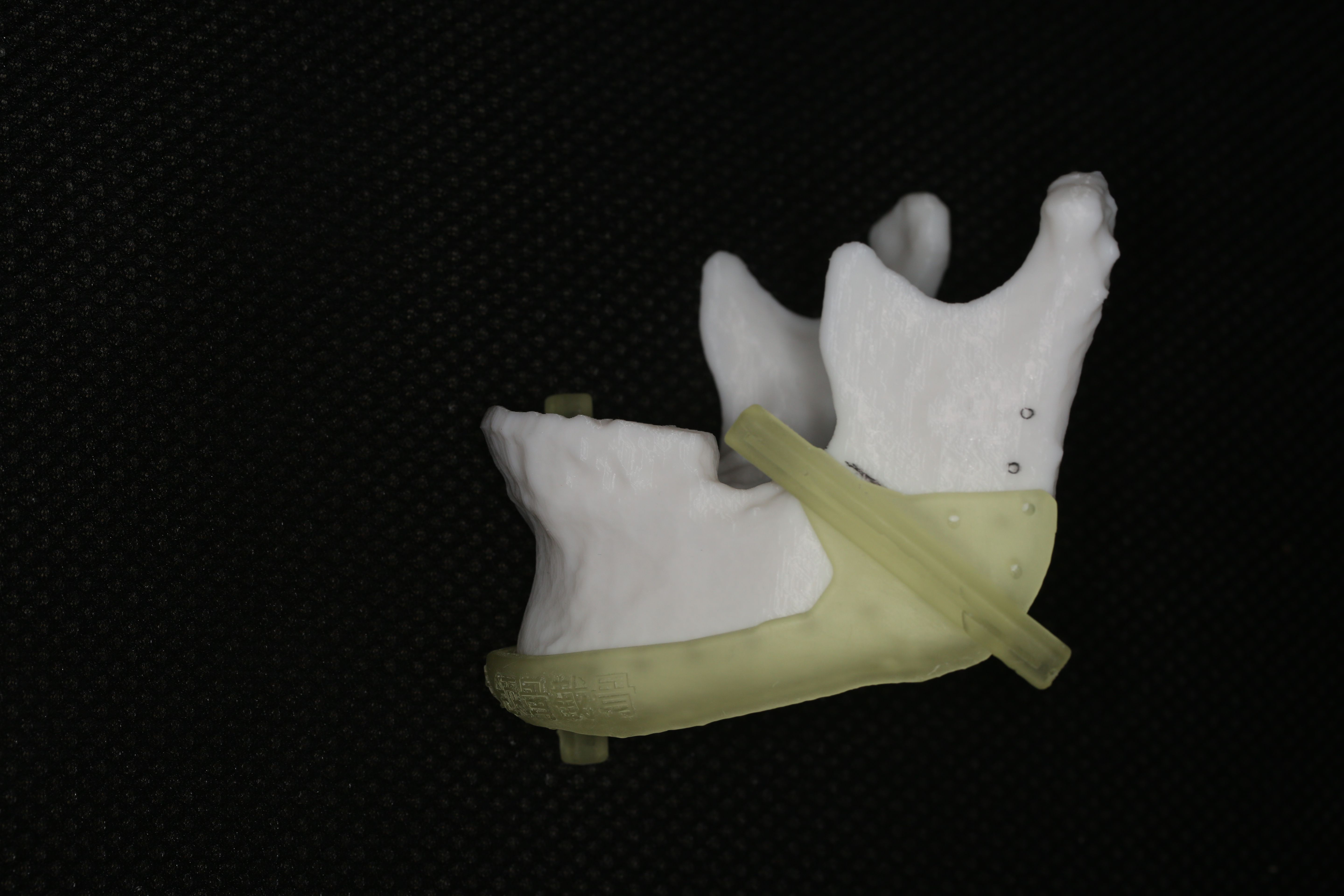 四、基于数字化技术及3D打印的口腔颌面部缺损修复以及功能重建。1.针对颌骨缺损二期修复的数字化设计及3D打印。2.针对骨组织皮瓣游离移植修复的术前数字化设计及3D打印。3.针对复杂种植修复,如腓骨种植等的数字化导板设计及3D打印。(图为下颌骨头模打印以及手术导板制作)