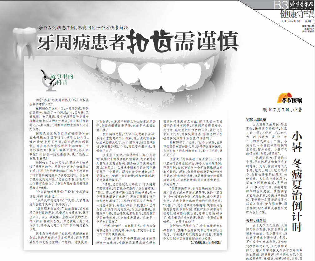 【北京青年报】牙周病患者扣齿需谨慎(2015年7月6日 B3版 健康守望)