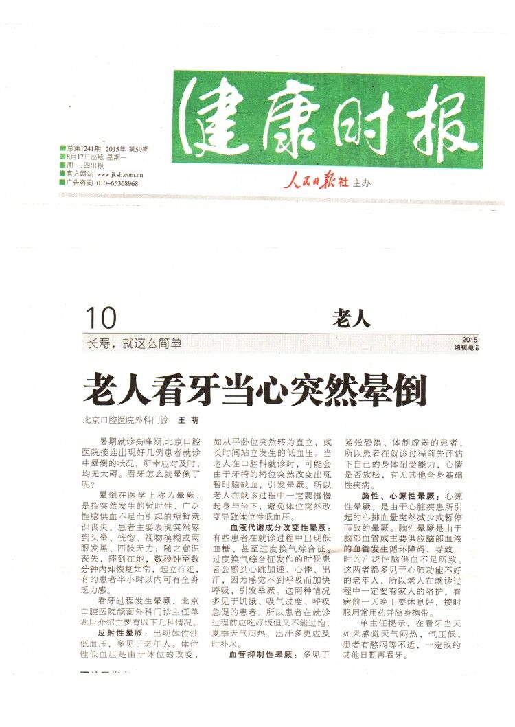 【健康时报】老人看牙当心突然晕倒(2015年8月17日 第10版)