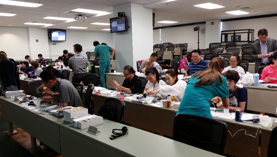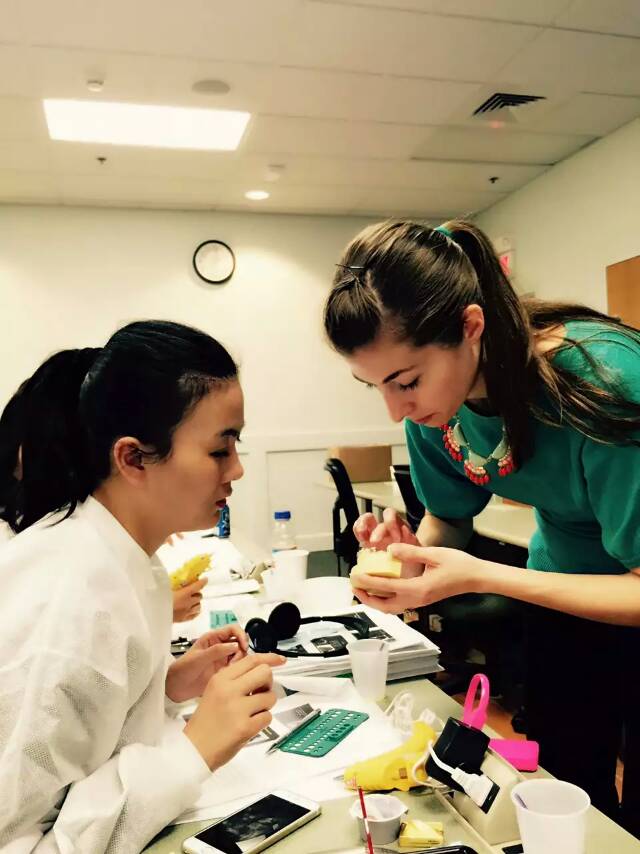 课程中最精彩的部分还是托槽间接粘接课。这堂课由正畸科主任Dr. Jeffery Godel主讲。Dr. Godel一直在天普大学和宾夕法尼亚大学担任全职教授,并且是颌面整形外科的专家。这位外表萌萌的老教授的讲课风格深入浅出,娓娓道来,总能把复杂问题用简单的语言表达出来。间接粘接实操课程首先由正畸科的研究生为大家展示了托槽间接粘接过程,之后学员分为小组,每人都拿到自己的托槽和模型,教授们开始手把手的教大家如何操作。从托槽定位技巧,到模板转移的准确性,每一步教授们都悉心指导。