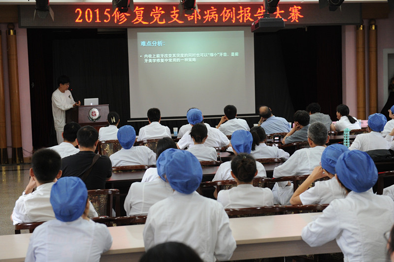 2015年9月8日,北京口腔医院修复党支部在医院多功能厅开展了优秀病例报告评选活动,与会人员为:张振庭书记、刘淑敏副书记、修复支部全体党员及部分科内人员。活动内容为:修复科与技工中心选出十一名医师和技师分别就自己的专业特点做病例报告。