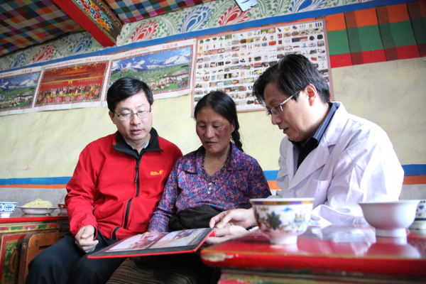 虽然语言不通,卓玛仍热情的请大家到安居房内就坐,端出早已准备好的牦牛奶和酥油茶招待大家,还拿了出五年前在北京治疗时的照片和大家分享术前、术后的故事。因为摘掉了肿瘤,卓玛恢复了劳动能力,在当地政府和广大爱心人士的帮助下,卓玛的生活逐渐得到改善,不仅住上了政府的安居房、看上了电视,家里的牛羊也渐渐多了。富裕起来的卓玛逢人便说是北京的医生救了她,是党和政府救了她。韩正学主任再次为卓玛进行了复查,术后恢复非常好,甚至连手术瘢痕也已经基本看不到了。大家不禁为韩主任的医术而赞叹,更为卓玛的幸福生活而高兴。