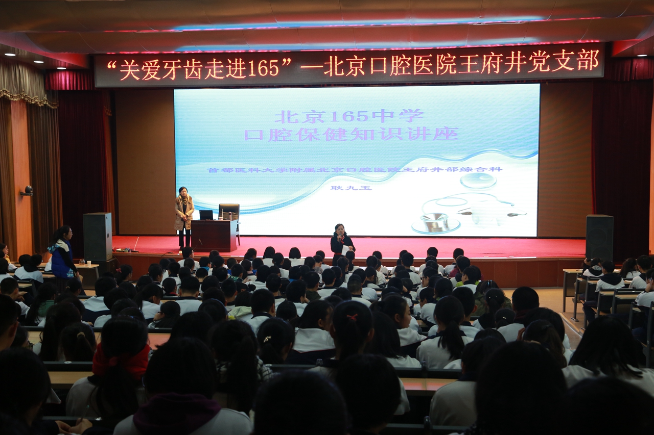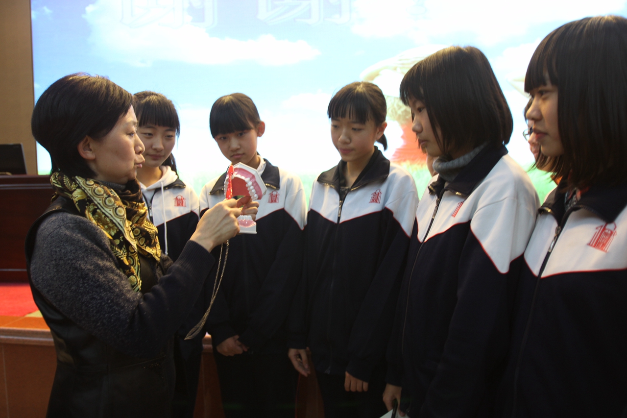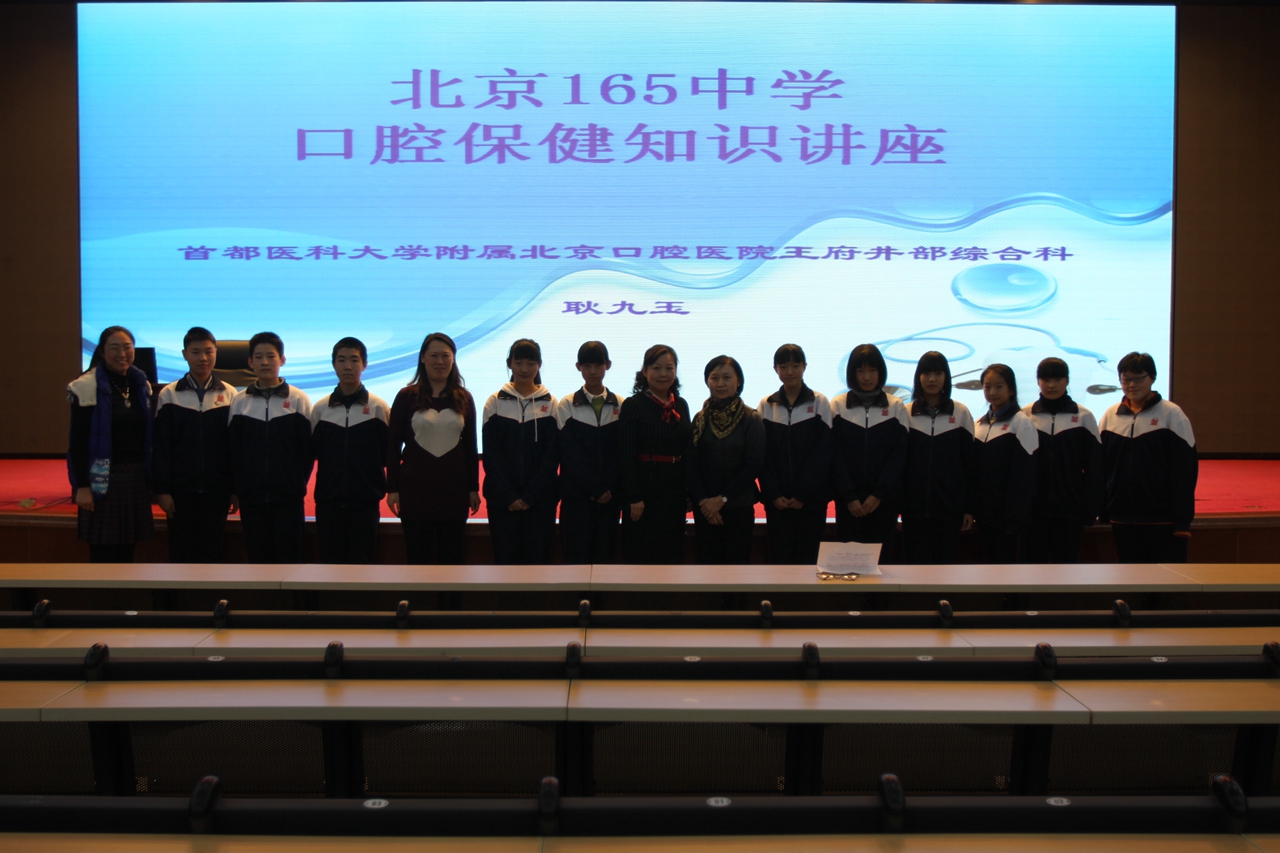 主讲人是北京口腔医院王府井部综合科退休专家耿九玉。耿老师结合中学生求知欲望强烈,对专业知识具备一定的理解能力等特点,深入浅出,耐心细致地为同学们讲解了龋病、智齿及牙周疾病的形成因素、疾病进程、治疗方法、预防措施和正确的刷牙方法等等,并回答了同学们提出的各类口腔问题,现场气氛热烈,掌声不断,得到了老师和同学们的一致好评 。
