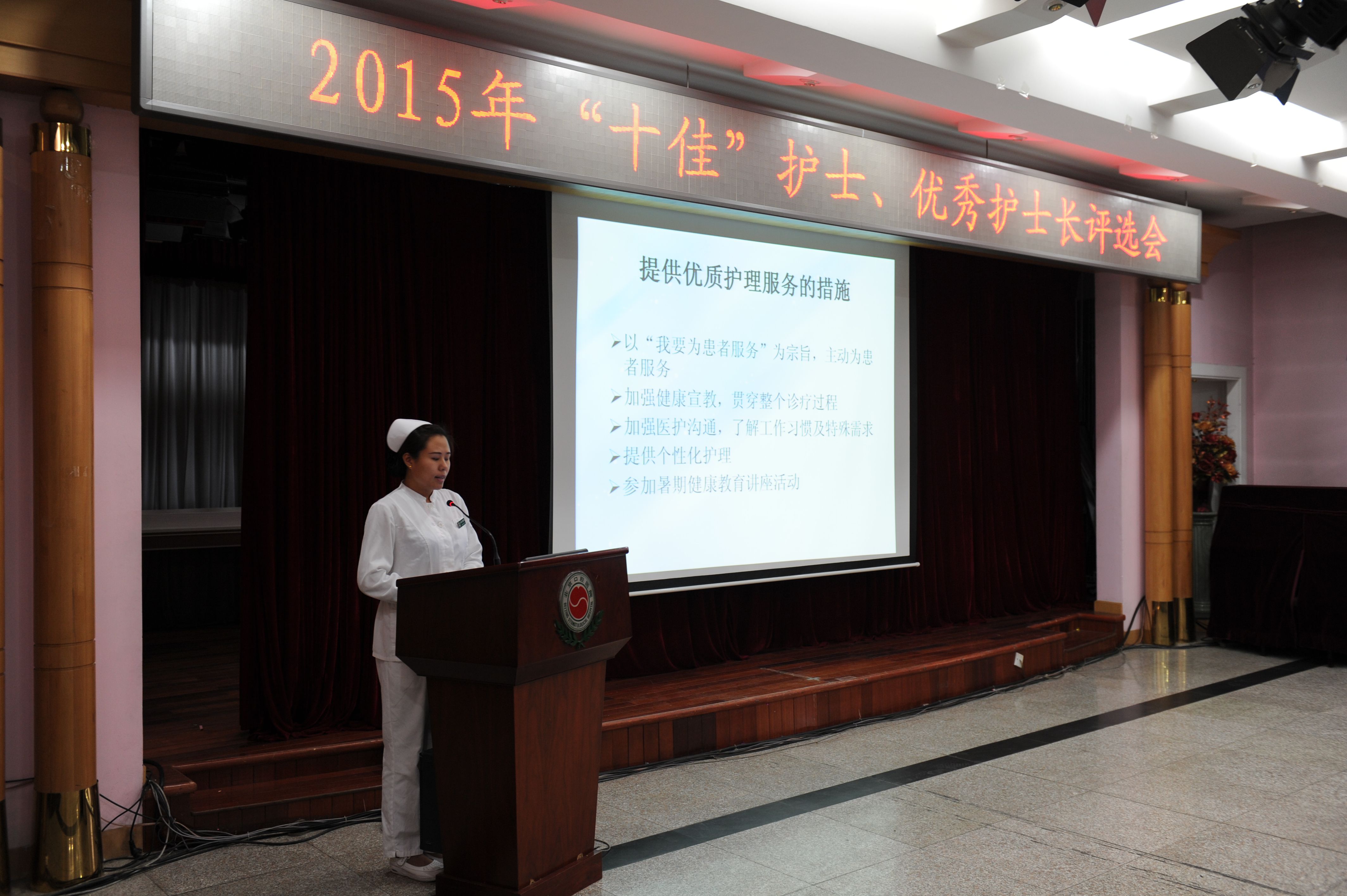 候选人员汇报后,全体护士长作为评委打分,现场成绩与经过审核的初评成绩相加,评选结果现场统计并公布,最终评选出2015年度“十佳护士”10名,优秀护士长3名。