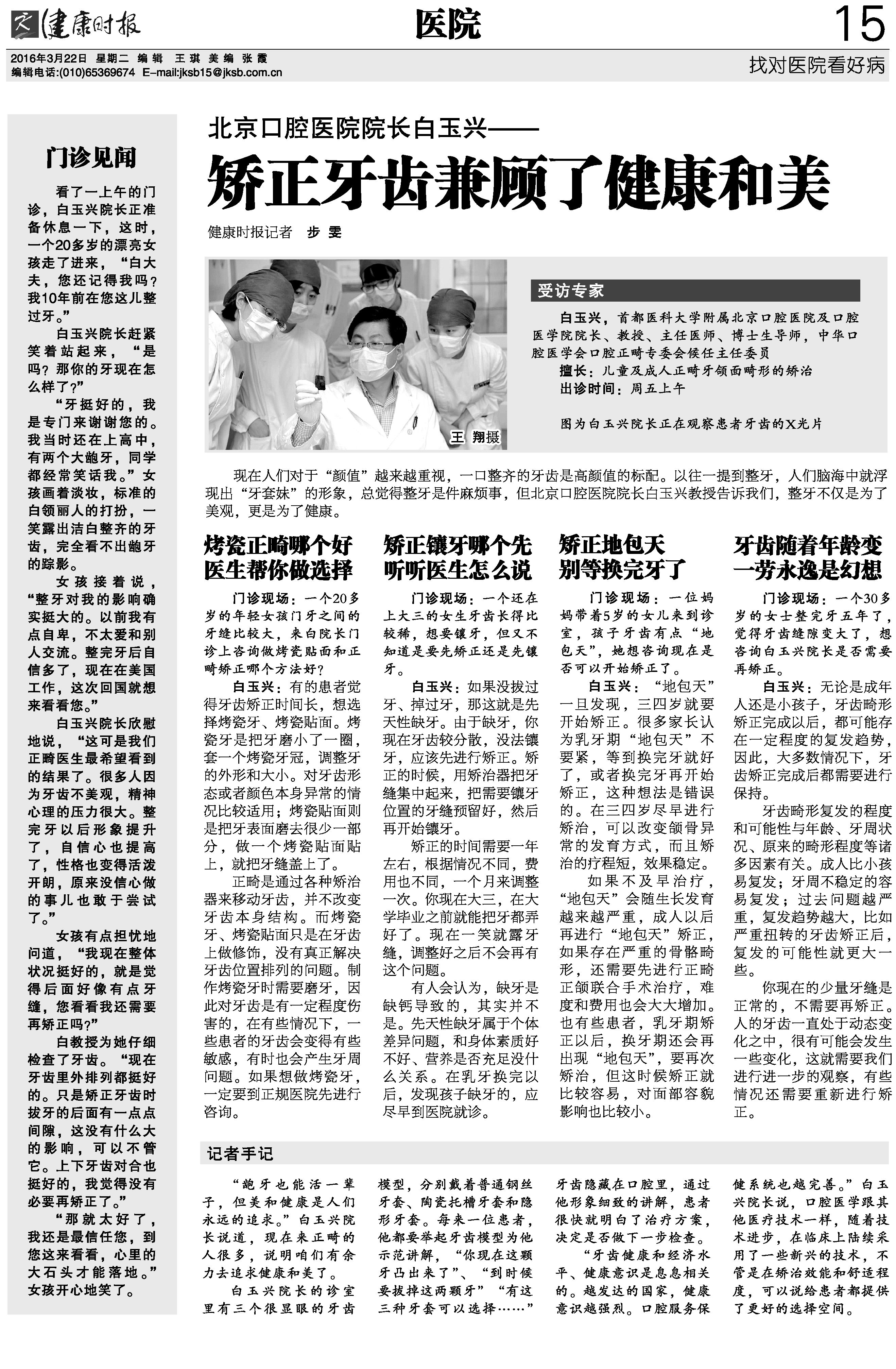 【健康时报】北京口腔医院院长白玉兴——矫正牙齿兼顾了健康和美(2016年3月22日 第15版)