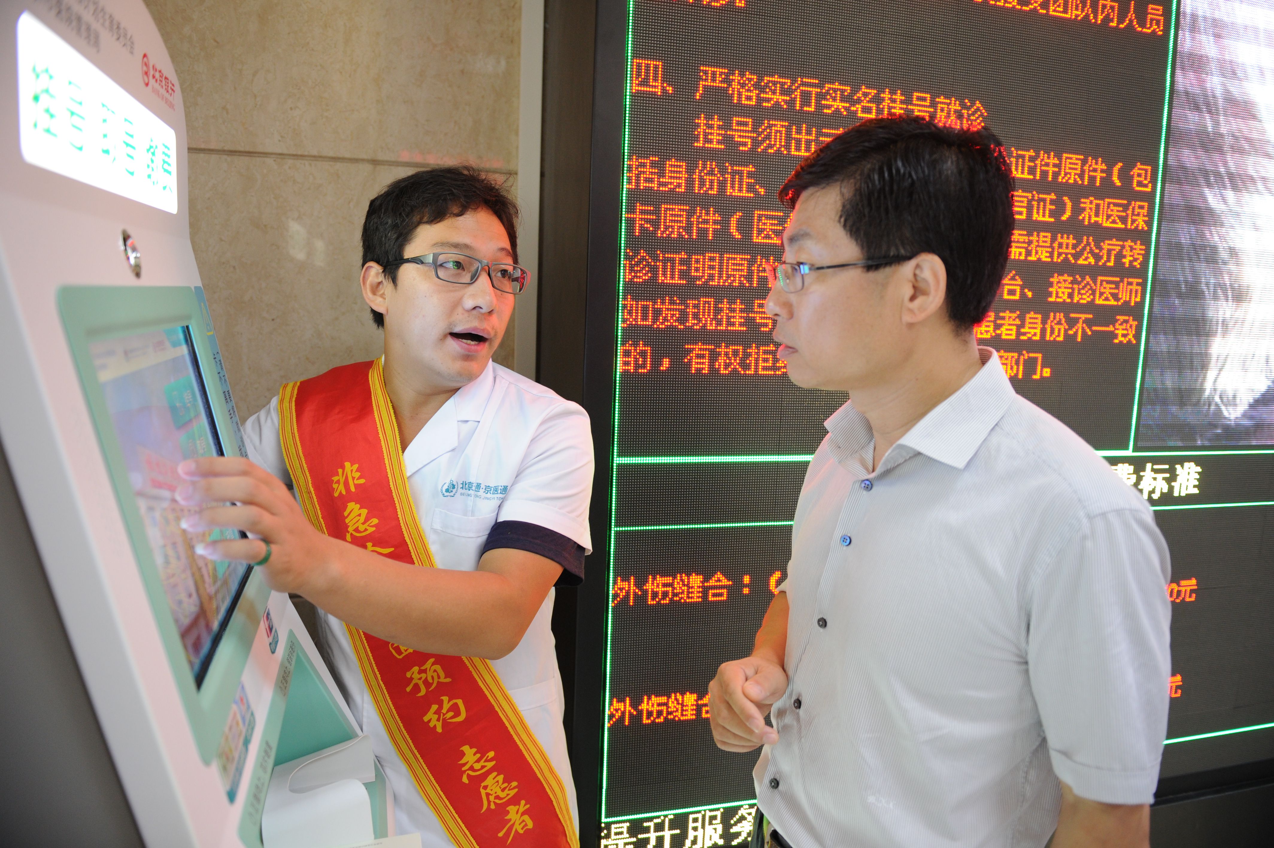 巡查中,一行人早8点来到门诊挂号大厅,查看了自助机预约挂号、取号情况,详细询问了咨询台工作人员及本木医疗志愿者如何引导、帮助患者预约挂号;重点了解了老年人建卡、关联专用窗口及老年人专用自助机的运行使用情况,现场询问了前来挂号的老年患者对非急诊全面预约的知晓情况,并引导一位老年患者在咨询台工作人员的帮助下成功预约了周日号源。