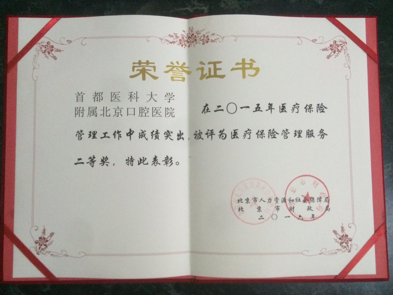 北京口腔医院获得“2015年度医疗保险管理服务二等奖”