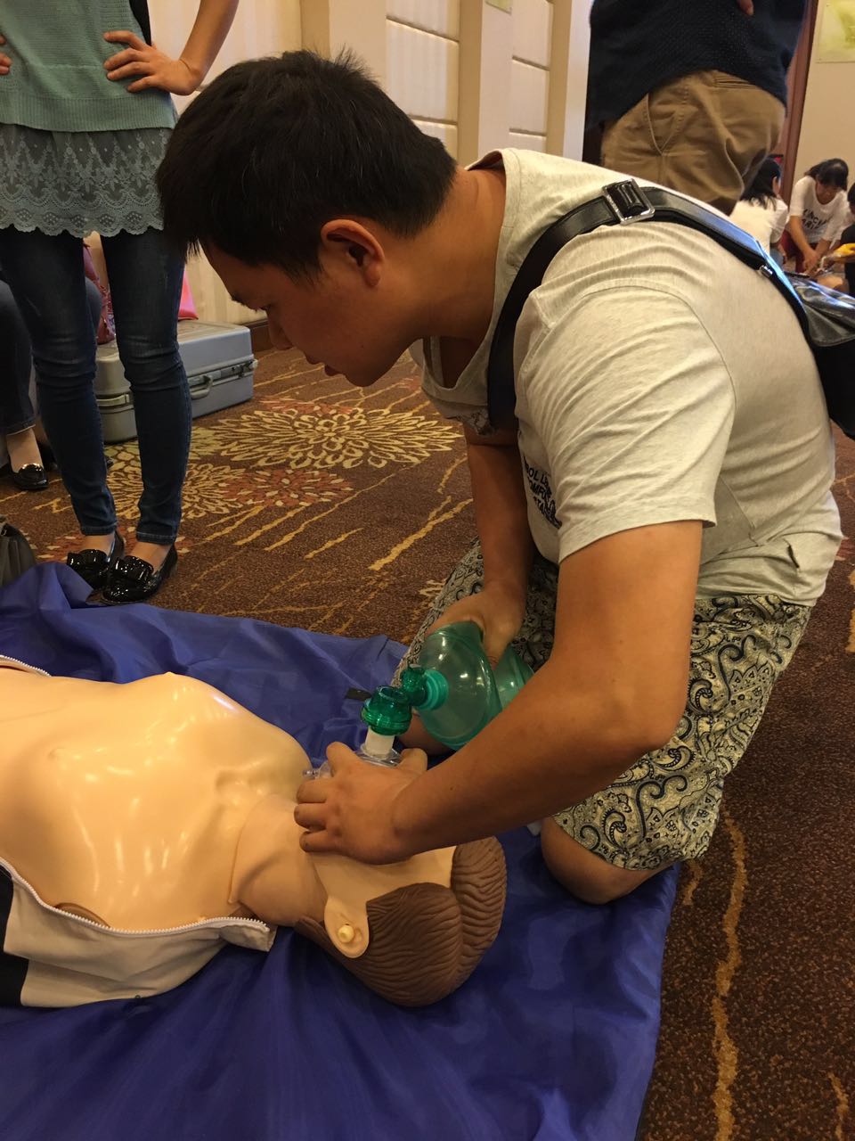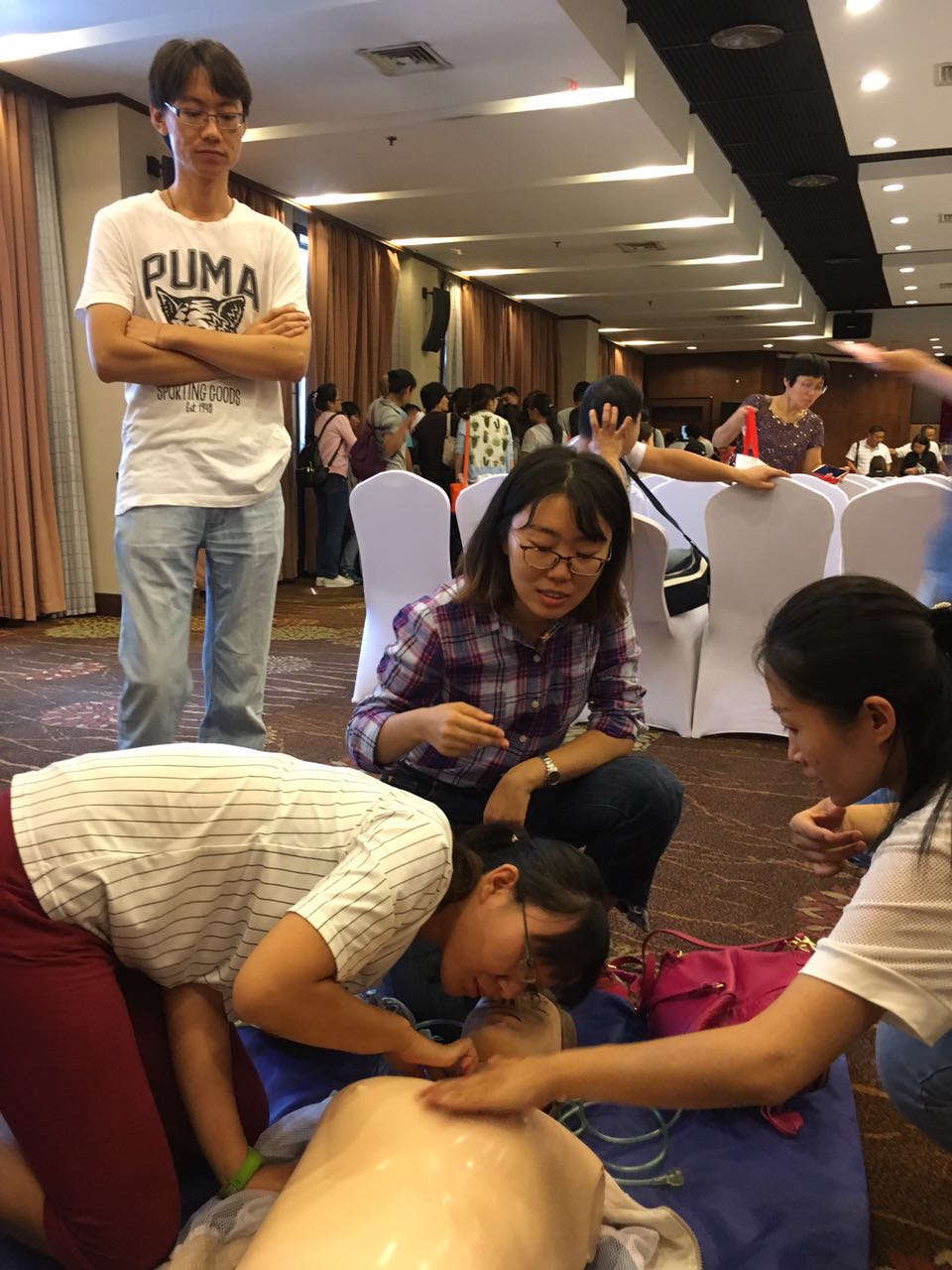 本次培训包括理论培训和实践技能操作培训两部分内容。在理论培训中,扈大为副主任医师详细介绍了口腔门诊常见急症的处理知识,以及国际上现行简化CPR的相关要点。张昕副主任医师就口腔门诊治疗过程中突发急症的防范与处理做了深入讲解。在随后的实践技能操作培训中,参训人员以科室为单位分为两组,依次完成了急救包必备物品及使用方法、心肺复苏的标准及方法、除颤仪的使用方法、氧气装置的使用方法、心电监护仪的使用方法五个项目的培训内容。