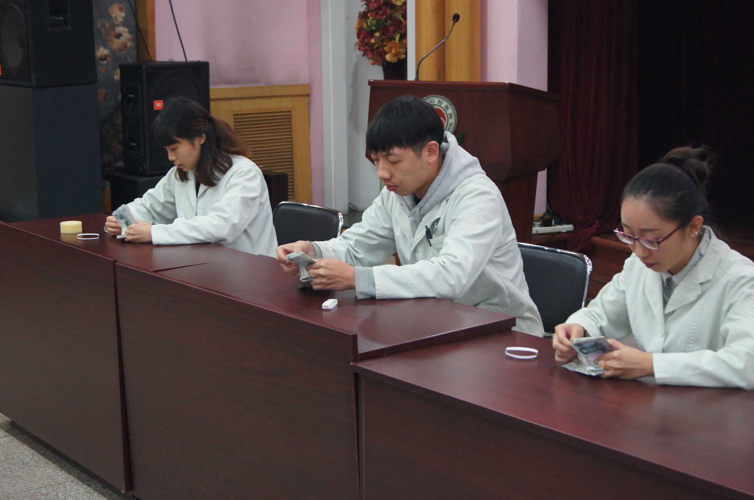 随后,财务处的三位职工为观众展示了精彩的“点钞竞速”。只见数量不同的三小沓钱分别交到三位选手手中,随着一声令下,三位职工分别用自己熟悉的手法快速清点钱币。10秒不到,已有一位选手点完并通过验证,观众纷纷赞叹不已。