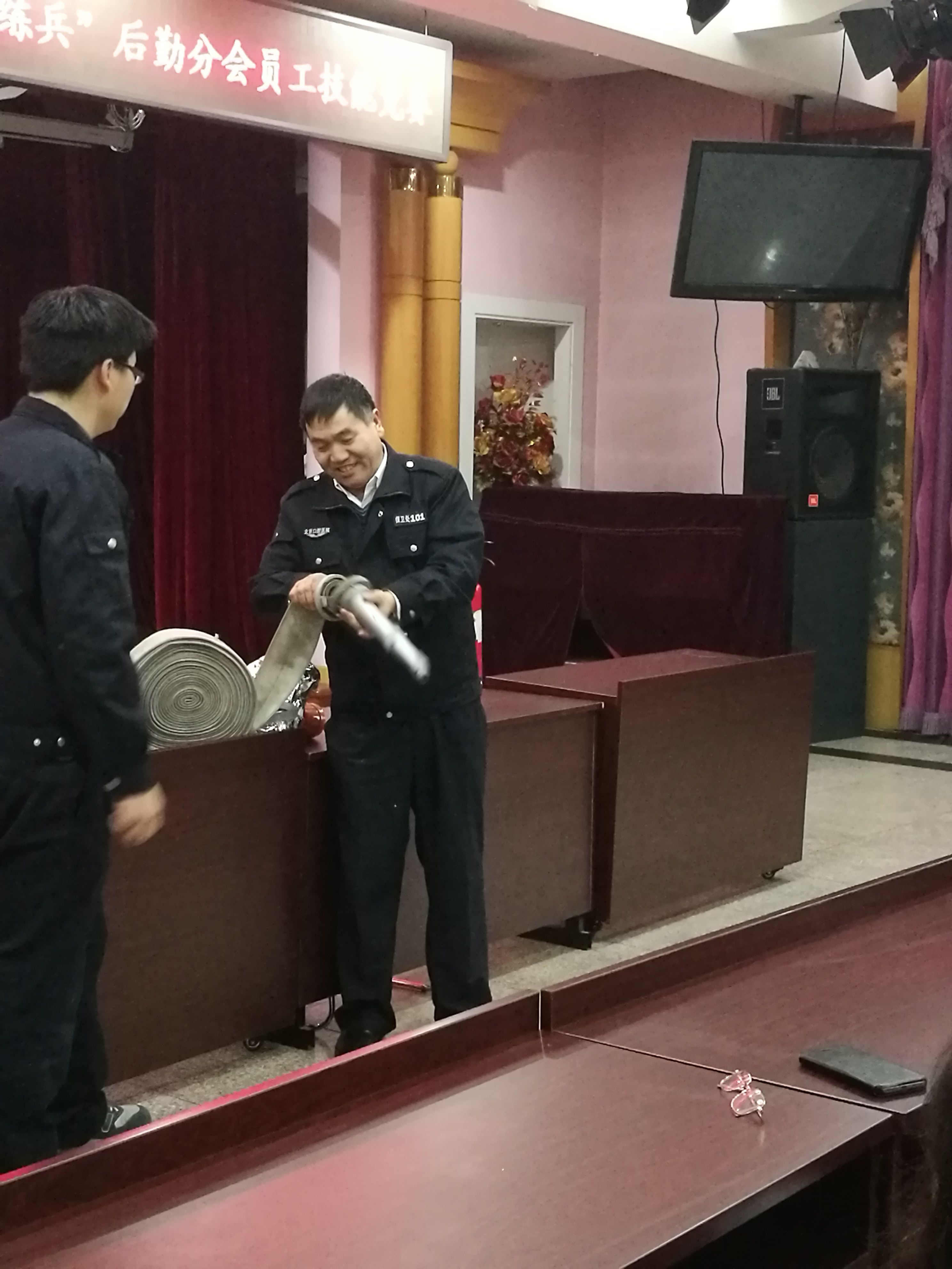 最后上场的保卫班人员一边向大家科普如何预防、杜绝火灾隐患及发生火灾如何处理的安全常识,一边现场演示灭火器的使用方法,具有很强的实用性。