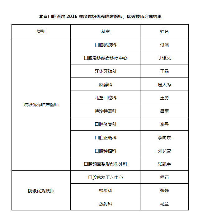 北京口腔医院2016年度院级优秀临床医师、优秀技师评选结果揭晓