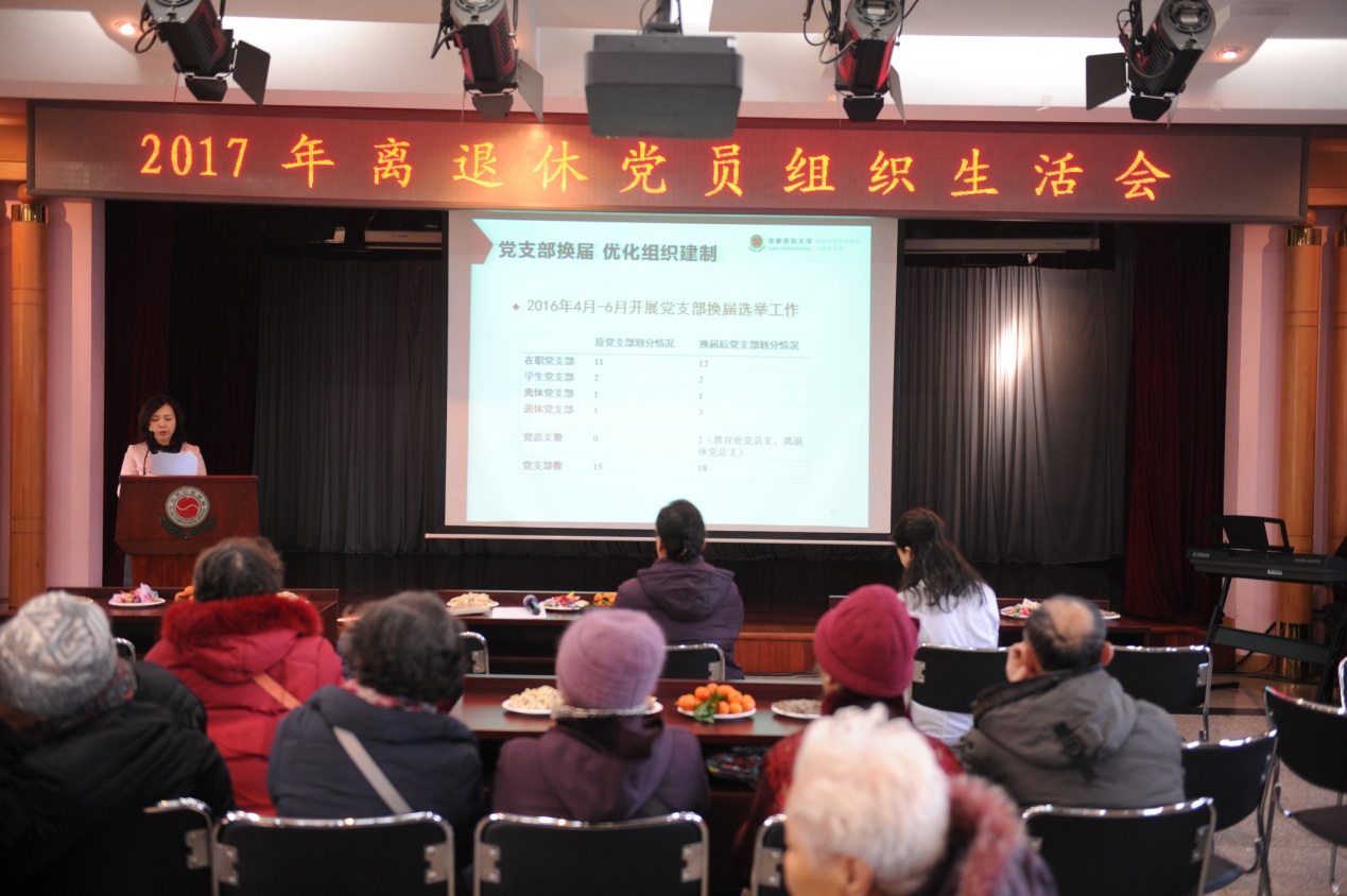 副院长刘淑敏向大家通报了2016年医院行政管理工作情况和年度内医院在医教研防等方面的重大事项,着重介绍了有关离退休工作的上级指示精神,离退休费的发放改革情况等,并向大家通报了离退休党员党费收缴情况。
