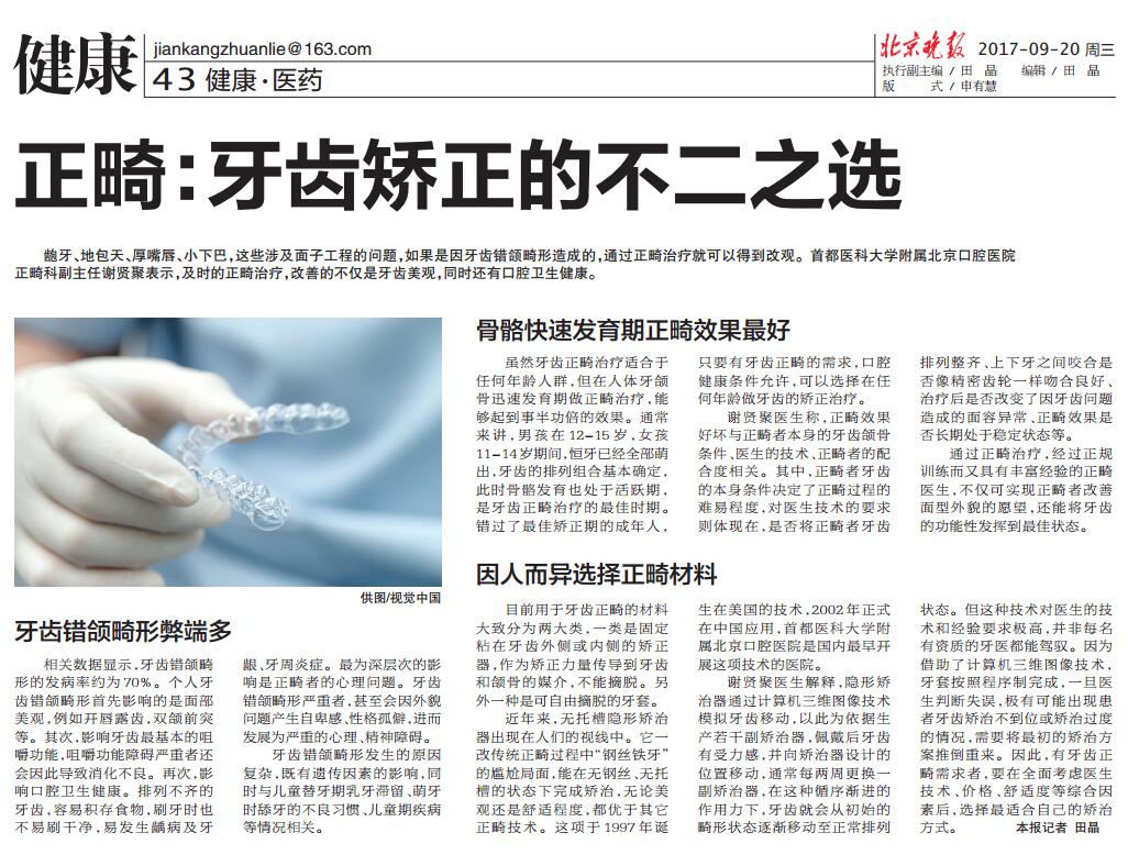 【北京晚报】正畸:牙齿矫正的不二之选(2017年9月20日 第43版)