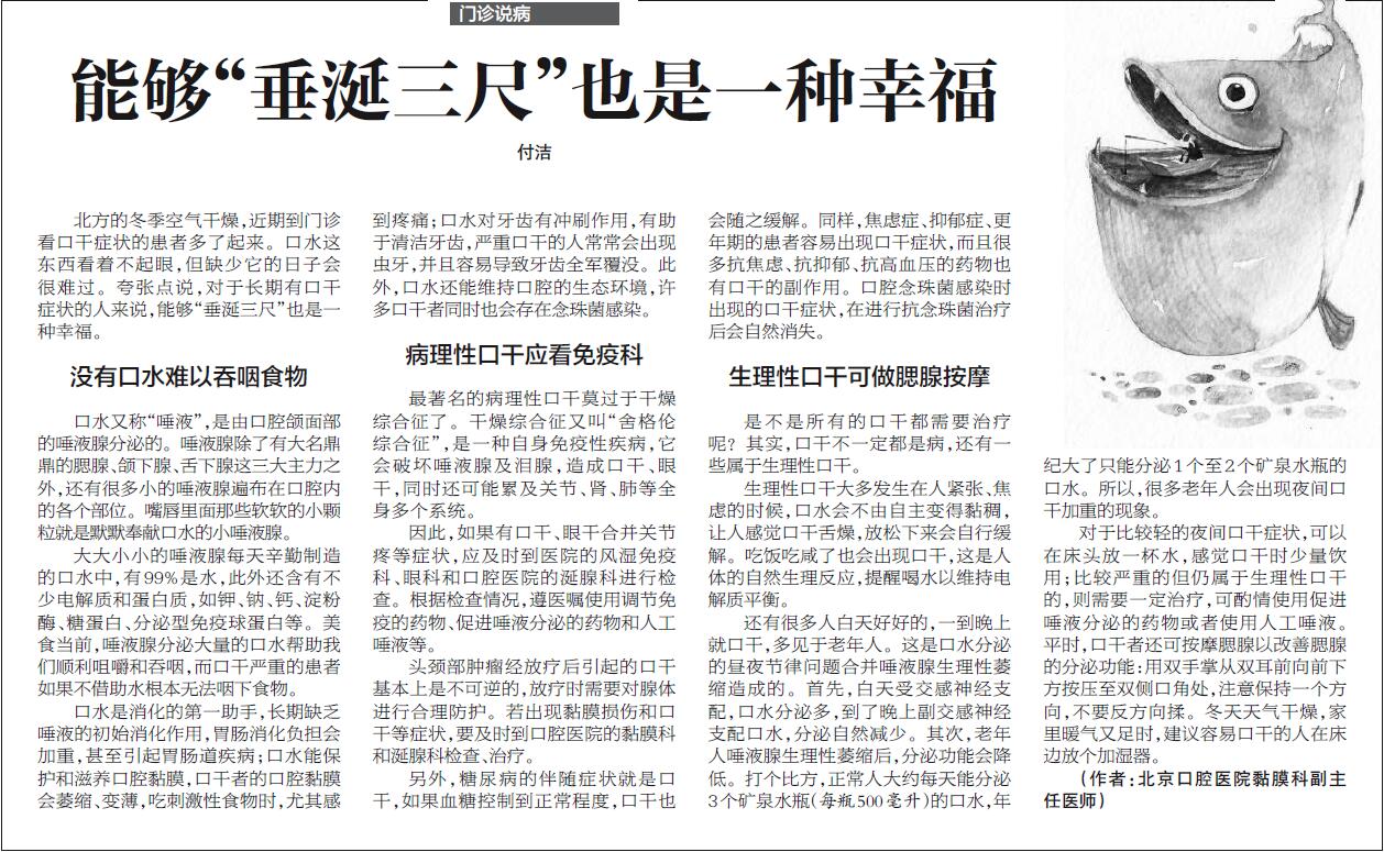 北方的冬季空气干燥,近期到门诊看口干症状的患者多了起来。口水这东西看着不起眼,但缺少它的日子会很难过。夸张点说,对于长期有口干症状的人来说,能够“垂涎三尺”也是一种幸福。