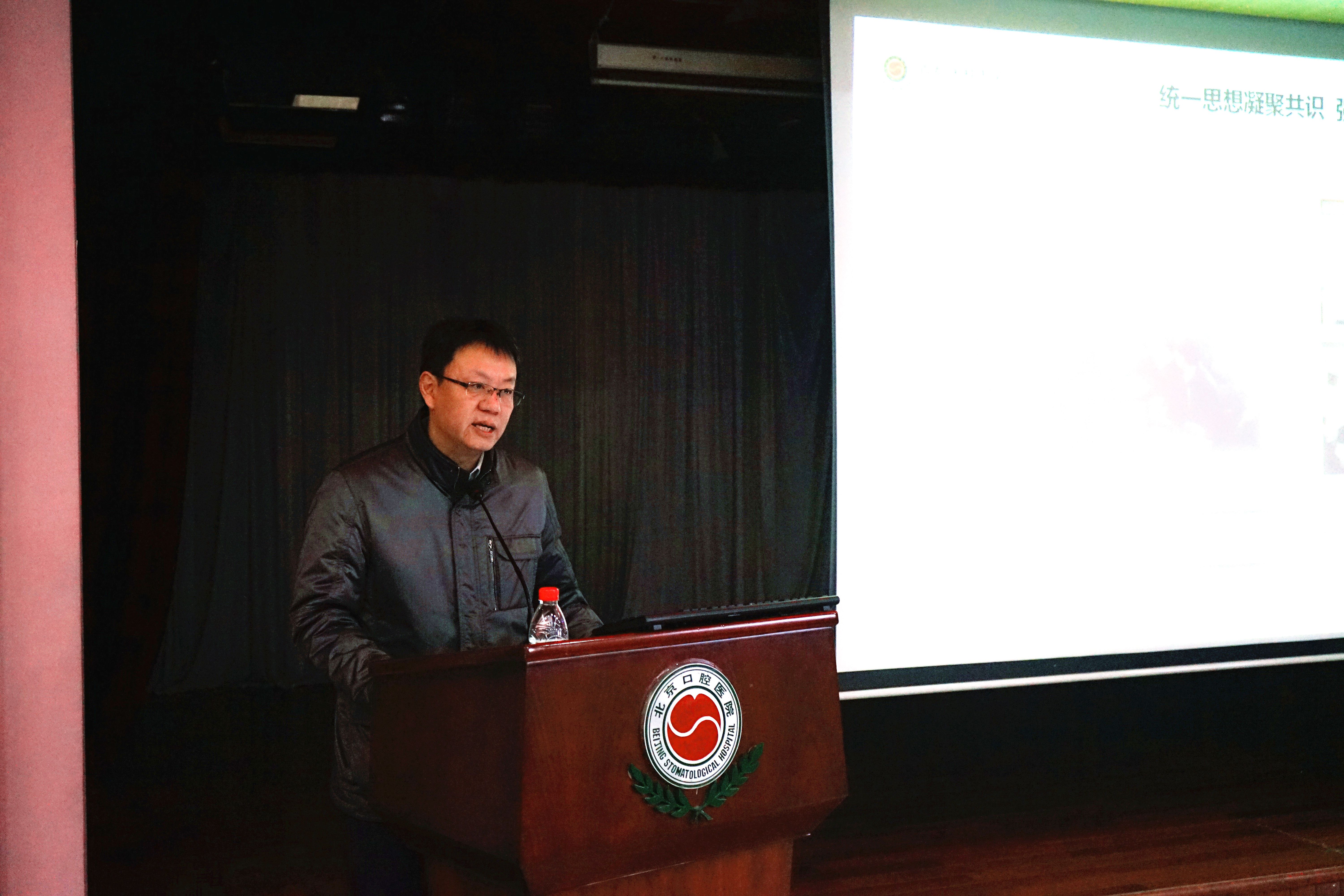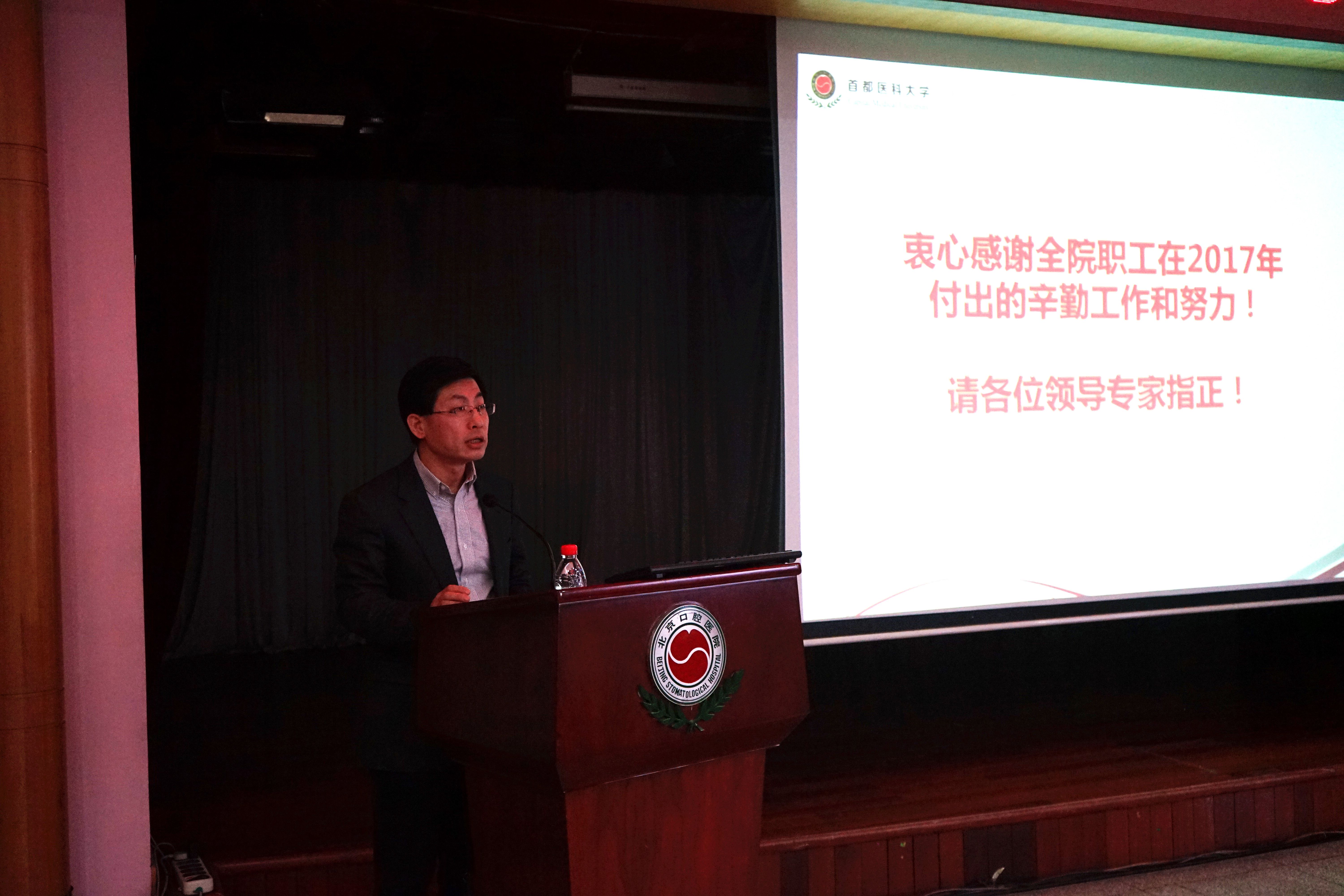 党委书记郑东翔同志代表院党委作党委工作报告。郑书记指出,2017年,在市卫生计生委及市医管局党委领导下,北京口腔医院党委深入学习贯彻党的十九大精神,坚持落实全面从严治党主体责任,全面推进党的政治建设、思想建设、组织建设、作风建设、纪律建设,把制度建设贯穿其中。为推进公立医院改革发展、提高人民群众看病就医的获得感和安全感,为医院更好地落实健康北京、健康中国战略提供了政治保障和良好氛围。