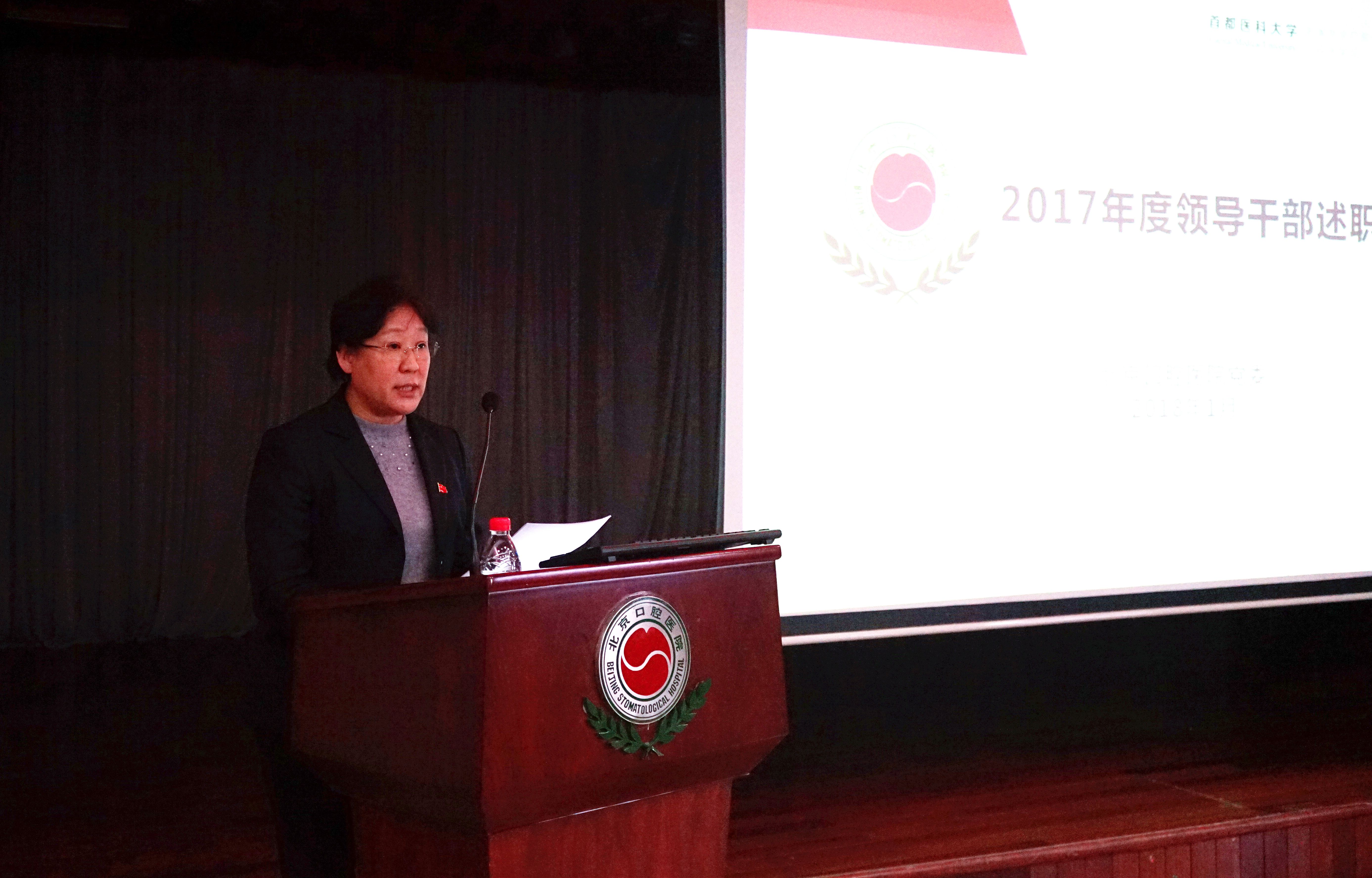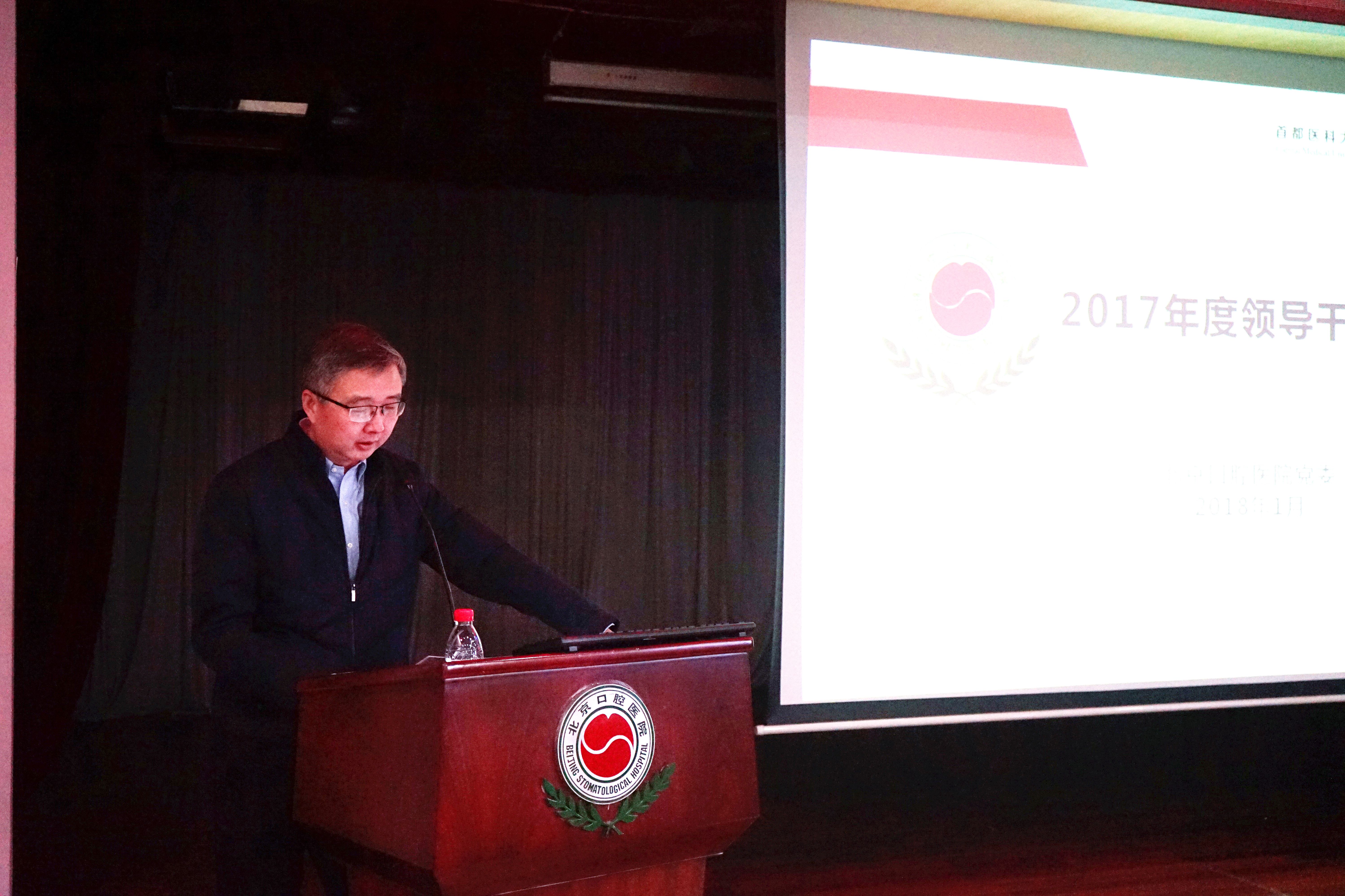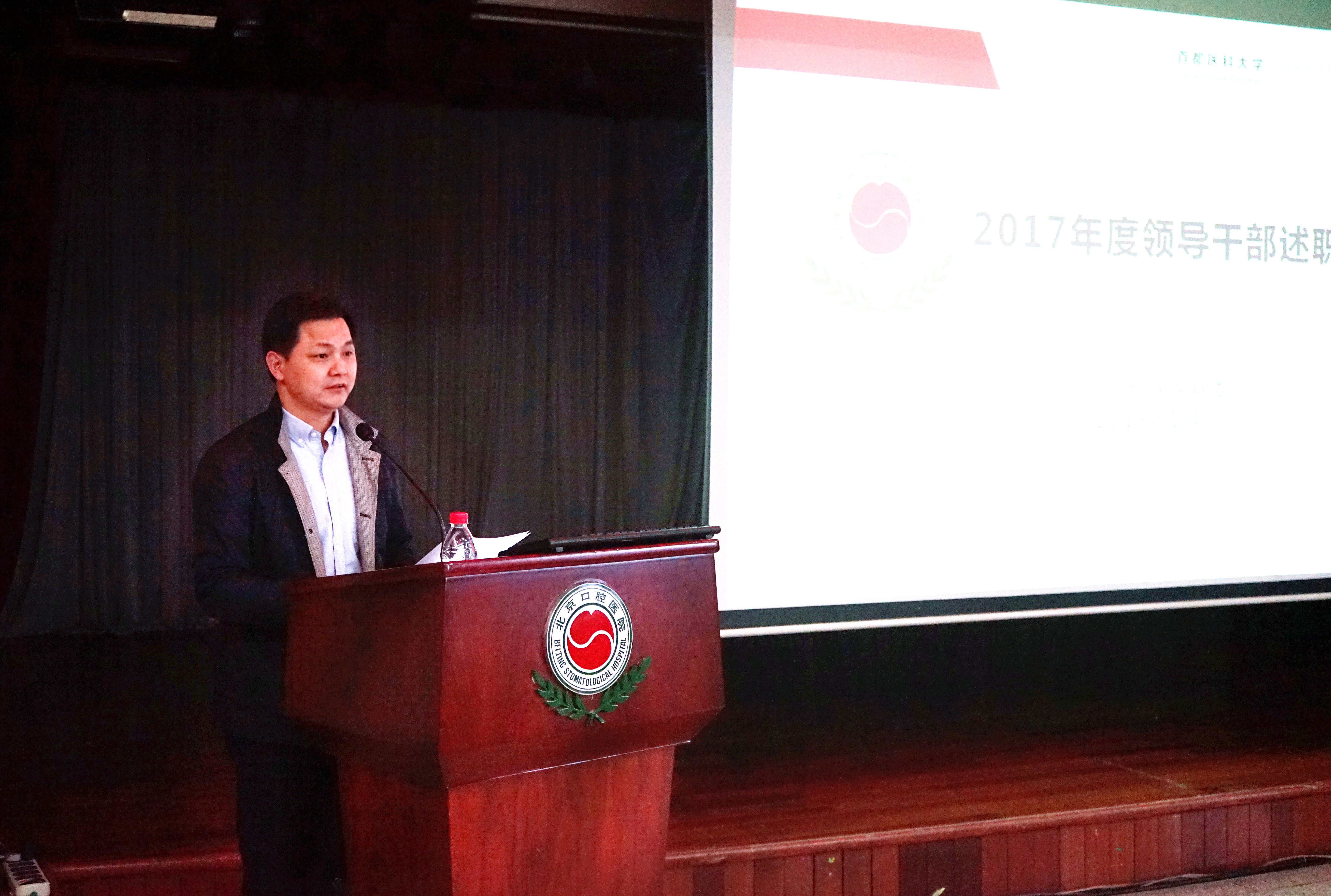 2018年1月29日下午,北京口腔医院在多功能厅召开了2017年度医院总结暨领导干部述职大会。北京市医管局副巡视员徐长顺、监事会监事周保利、组织与人力资源处干部唐天宇以及医院领导班子成员、中层干部和职工代表参加了会议。