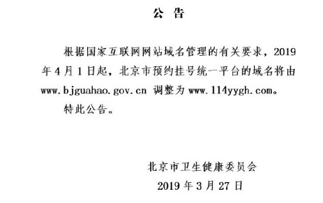 根据国家互联网网站域名管理的有关要求,2019年4月1日起,北京市预约挂号统一平台的域名将由www.bjguahao.gov.cn 调整为www.114yygh.com。 ????