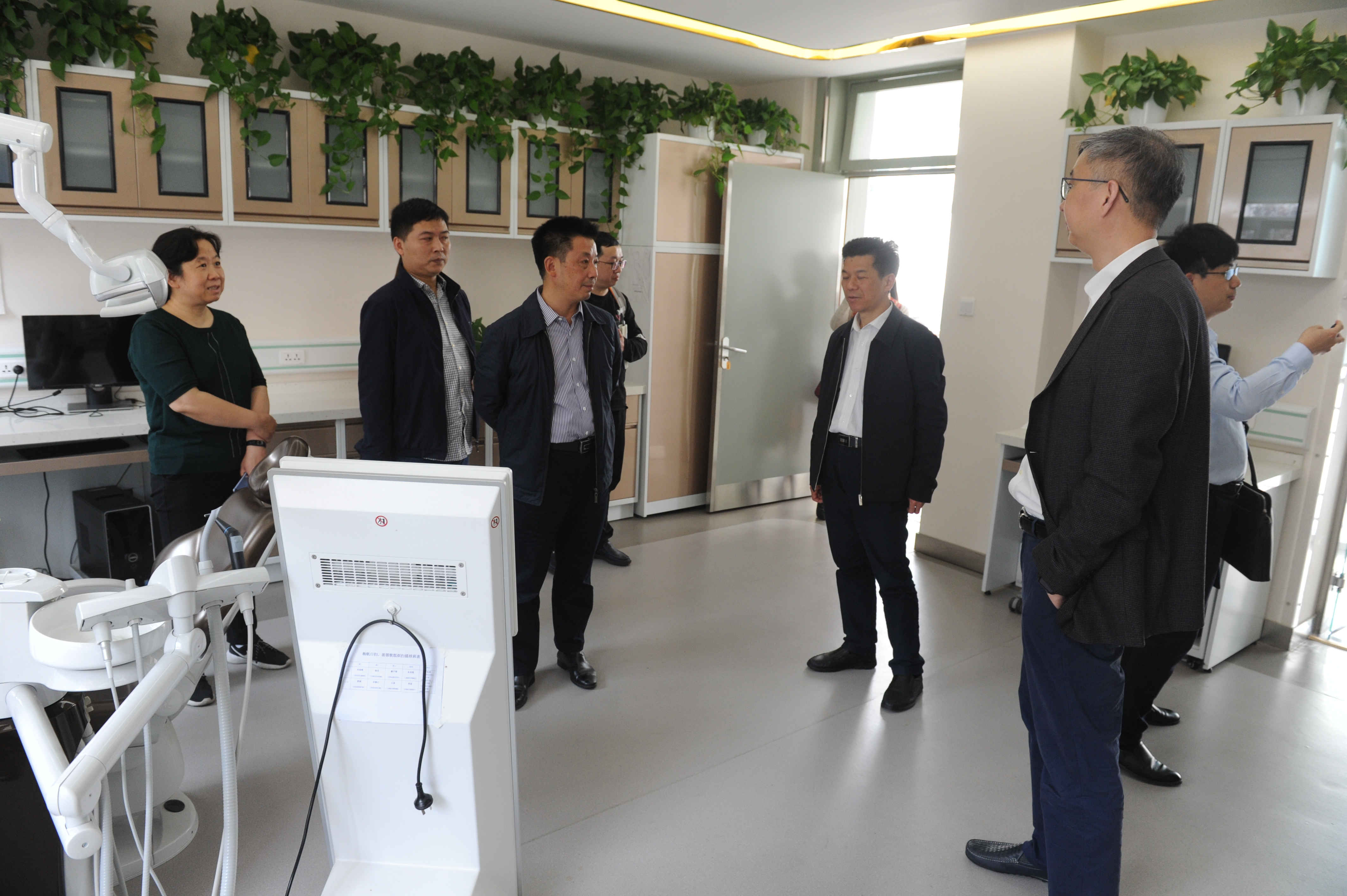 曾春明书记一行在厉松副院长陪同下参观了正畸数字化诊室、口腔无痛治疗中心、图书馆、仿头模实习室及机器人实习室。