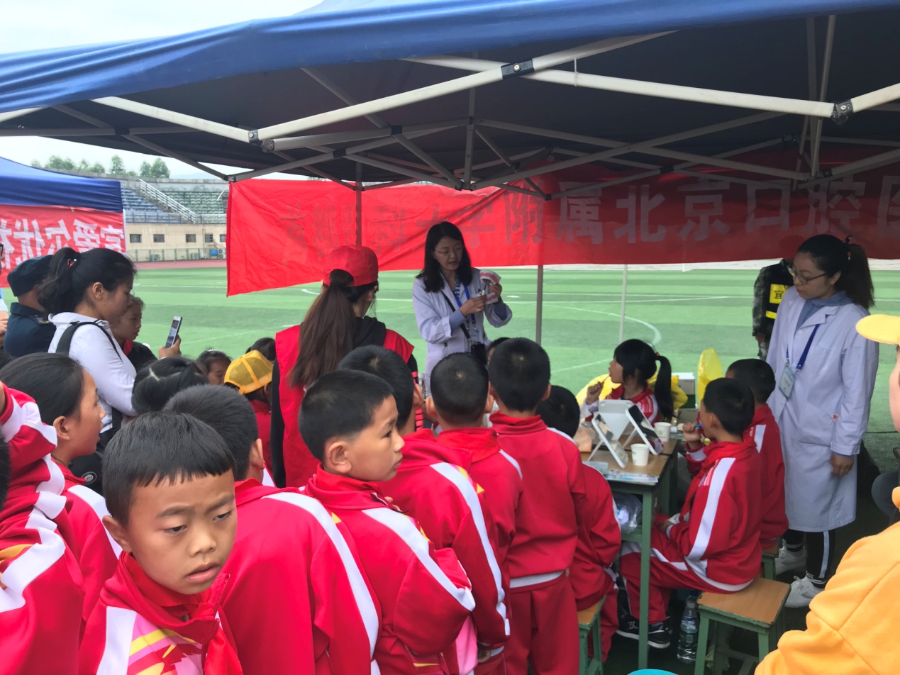 2019年5月18日上午,我院携手北京自然博物馆、中国消防博物馆、中国铁道博物馆等12家单位赴四川省宜宾市屏山县开展“全国科技活动周——流动科技馆进屏山”活动。我院牙体牙髓科医生刘锐、急诊综合诊疗中心医生梁昭璜、老年科护士郭颖一行3人把我院护齿训练营中丰富多彩的活动带到了现场。