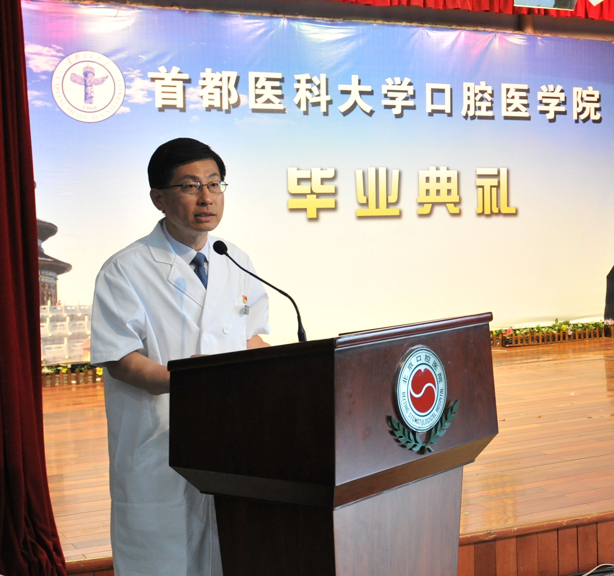 院长白玉兴教授向所有毕业生致以热烈祝贺,并叮嘱同学们走出校门后,保持学习心态, 秉承首医口腔“严精勤谨”的院训,在工作岗位上不断进取,展现首都医科大学口腔医学院优秀毕业生的风采。
