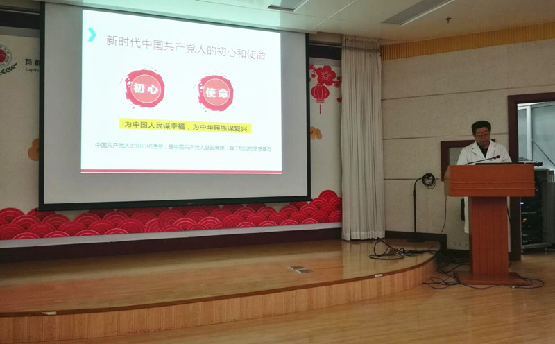 党委委员宋鹰首先介绍了“不忘初心,牢记使命”主题教育的重要意义、总要求及具体目标,随后带领大家一起学习了习近平同志对医疗卫生工作的重要论述,如:“无论社会发展到什么程度,我们都要毫不动摇把公益性写在医疗卫生事业的旗帜上,不能走全盘市场化、商业化的路子;维护好人民群众的健康权益在守初心担使命中占有重要的位置。”最后,结合“十三五”卫生与健康规划及贯彻落实北京医改相关工作,党委委员宋鹰对全体党员提出了工作要求:希望每一位医护人员从自我做起,钻研医术,弘扬医德,守初心、担使命、找差距、抓落实,在改善患者就医体验和提升医院服务质量等方面抓好落实,不断增强人民群众的获得感、幸福感、安全感,为广大患者提供更高水平、更加满意的医疗服务。