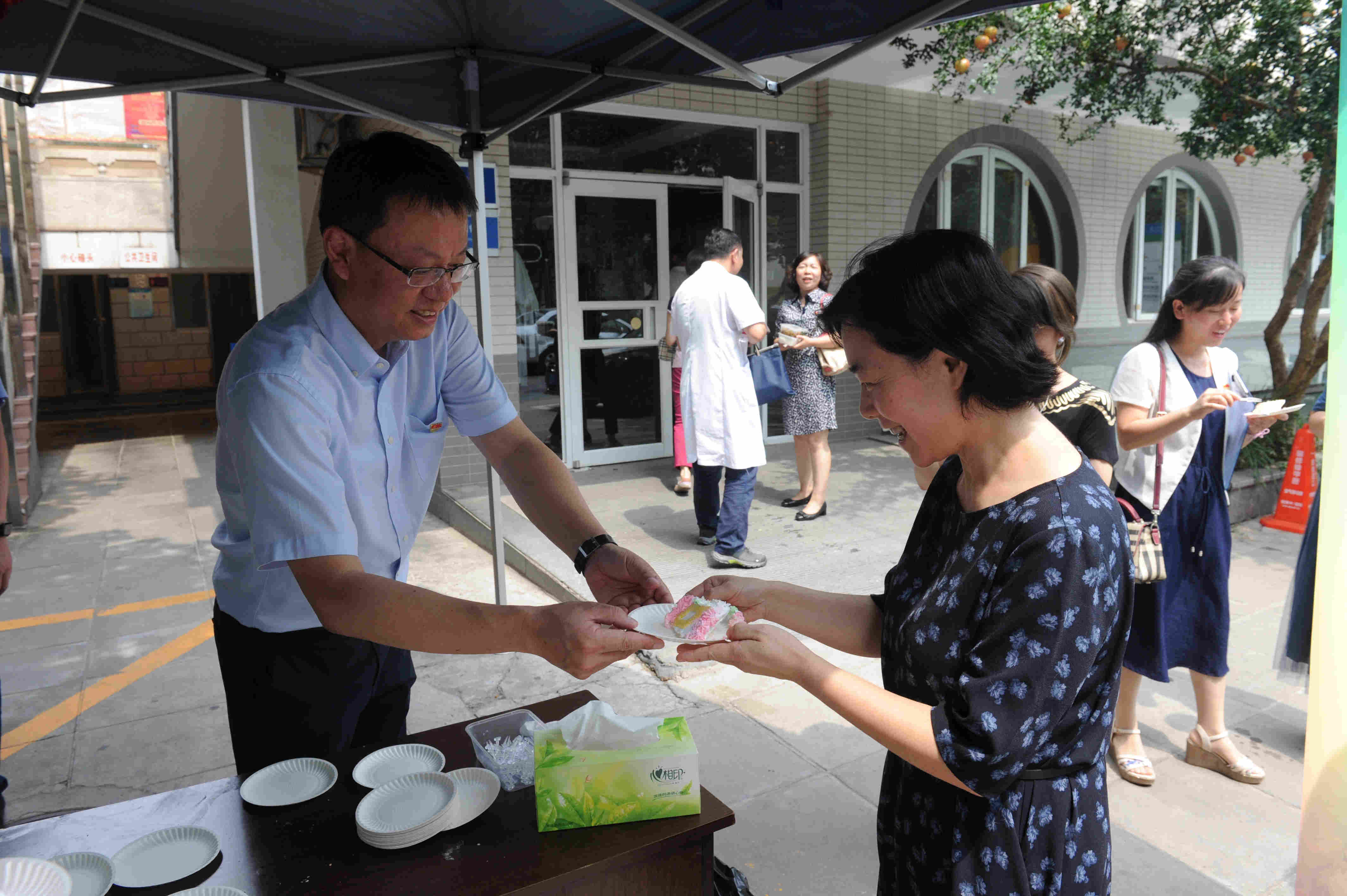 8月19日,我院开展“筑爱共分享”庆祝活动,院工会美食协会为全院医务人员定制特大型蛋糕庆祝节日。在天坛部食堂门口,院长白玉兴、党委书记郑东翔亲自为医务人员切分蛋糕;在王府井部六层会议室,医务人员共享甜美蛋糕,感受节日喜悦;傍晚时分,喜悦还特别传递到病房和手术室里夜班值守、拖班手术的医护人员,大家在岗位上共庆自己的节日。