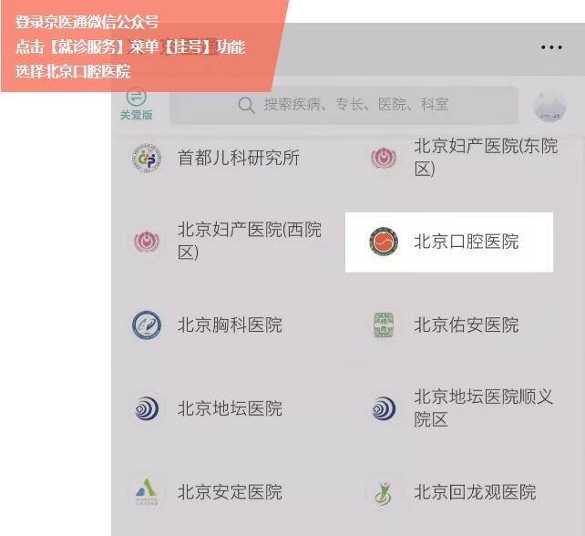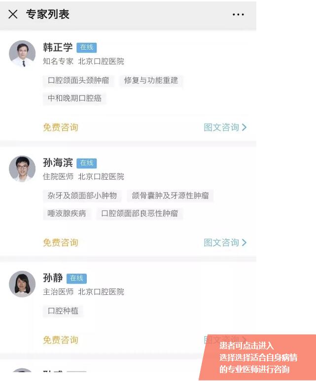 患者可用手机登录“京医通微信公众号”,点击【就诊服务】菜单【挂号】功能,在选择北京口腔医院后,点击上方我院院徽进入医院主页,即可看到【在线问医师】服务入口,患者可点击进入,选择适合自身病情的专业医师进行咨询。