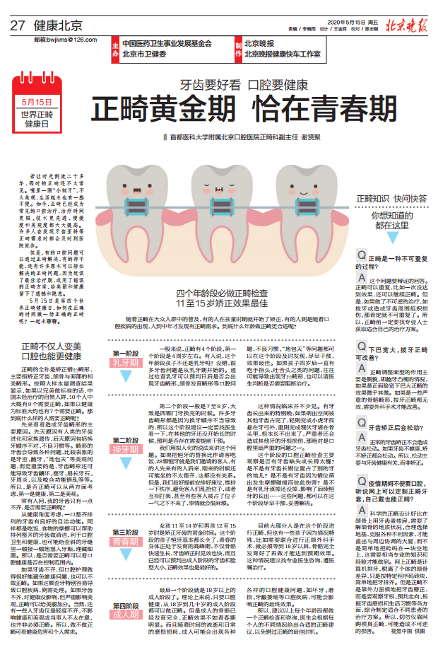 【北京晚报】正畸黄金期 恰在青春期(2020年5月15日 第27版 健康北京)
