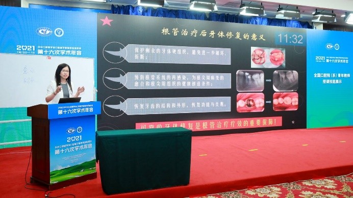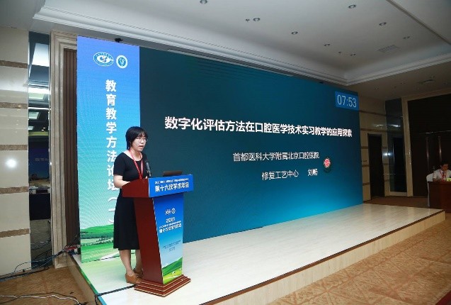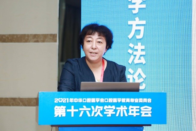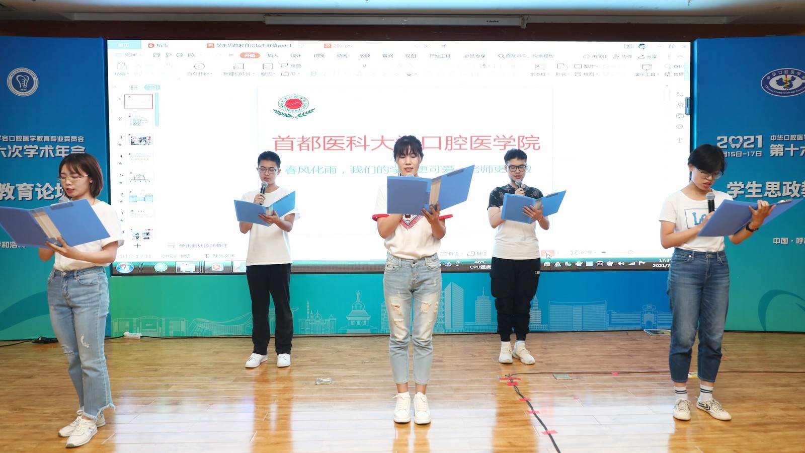 在开幕式上,白玉兴教授做《整合口腔医学资源 提升口腔人才培养质量》专题报告,展示了我校以“国家生命科学与技术人才培养基地”为载体,整合口腔医学资源,探索特色口腔医学人才培养之路的做法与取得的成效;在教育教学方法分会场,赵丽颖老师分享了《课程思政融入口腔医学导论教学的研究与实践》,和与会同仁交流专业课程思政建设的经验与体会;刘畅老师做题为《数字化评估方法在口腔医学技术实习教学中的应用探索》报告;在思政教育分论坛,教育处团支部书记冯征老师带领4名本科生表演了舞蹈《天天向上》,并结合PPT展示了我院学生思政工作情况和师生风貌。