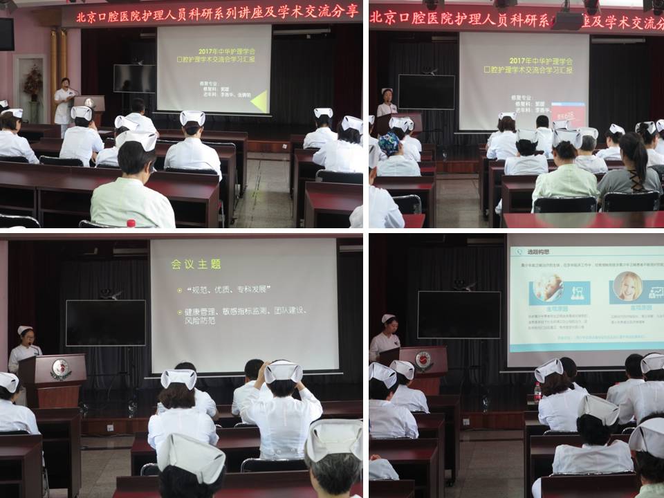 本次活动主要有两项内容:一是由参加中华护理学会全国口腔护理学术交流会的6名代表做汇报,与大家分享参会的学习成果;另一项是由科研处黄欣处长为护理人员做“护理科研选题”的讲座。参加全国口腔护理学术交流会的代表分别从正畸、修复等不同专业角度做了汇报,介绍了本人参会的论文、涉及本专业的优秀论文、自己今后撰写论文的思路等方面做了分享。黄欣处长以“护理科研选题”为主题,从选题来源、步骤、案例分析等方面做了精彩的演讲。