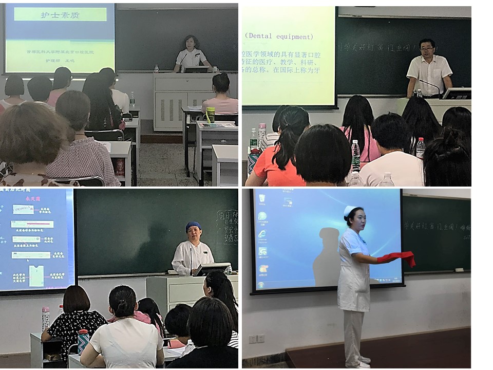 护理部提前将授课老师准备的课件印制成教材,课上老师们图文并茂、深入浅出的讲解,充分的调动起学员们的学习热情,课堂气氛活跃,学员与老师积极互动。参与授课的护士长耐心的教学员识别各种口腔器械,各专业指导老师手把手的教学员调拌口腔科常用材料。