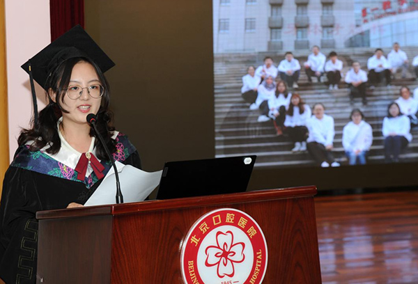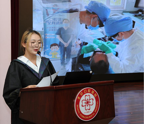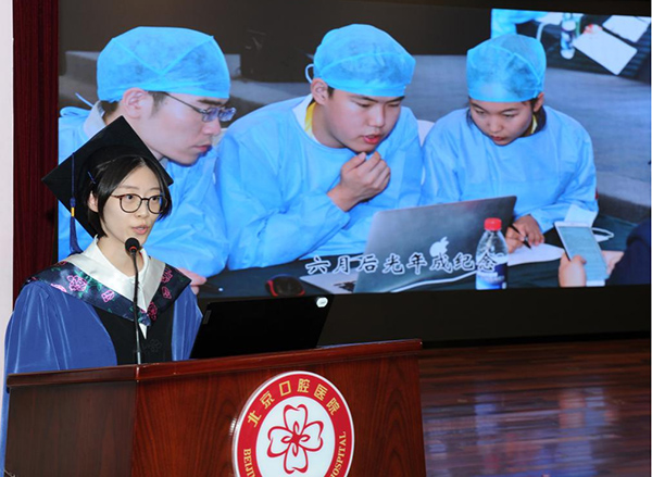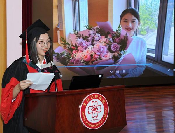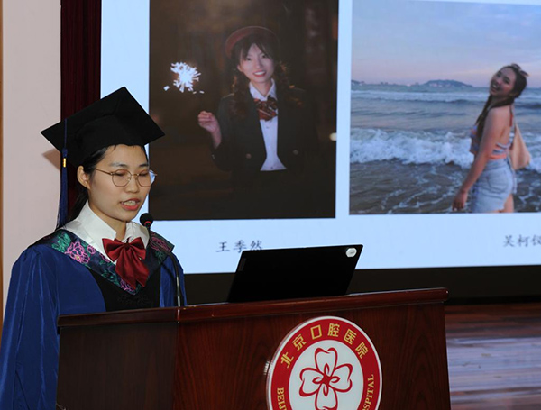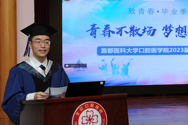 毕业生代表20级统招博士班许博文同学和15级长学制班乔清晨同学分享了各自的求学经历。他们回顾了在首医口腔学习生活的点点滴滴,感谢学校和老师的培养、同学的鼓励与帮助。