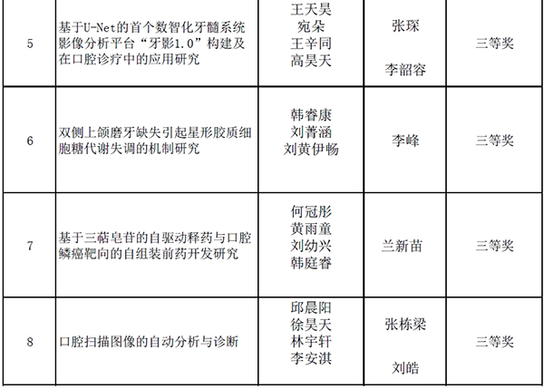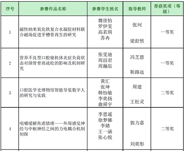 经过激烈的角逐和评委们的认真评议,最终评选出一等奖2项、二等奖2项、三等奖4项。其中,获得一等奖的两支队伍将代表首都医科大学口腔医学院参加“第十届全国大学生基础医学创新研究暨实验设计论坛”,与其他高校的学生团队一决高下。