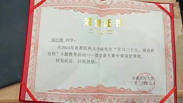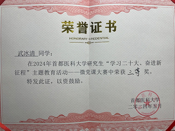 4月27日下午,首都医科大学研究生思想工作部举办的2024年首都医科大学研究生“学习二十大、奋进新征程”微党课大赛落下帷幕,我院教育三党支部武冰清同学荣获三等奖,教育二党支部那红娩同学获得优秀奖。