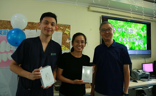 正畸医生中有句老话“粘托槽粘了几十年,闭着眼睛都能干”。本次医师节庆祝活动别出心裁设计了“闭目粘托槽”这一高难度挑战,吸引了全场医护人员的热情参与。医生们手持特制的托槽冰箱贴,蒙上双眼并在原地转圈后,前行至数米之外的牙齿纸板前,将“托槽”稳稳地贴在“牙齿”上。大家在欢笑中无不感叹:勤学苦练,永无止境,“粘托槽”这活儿,再资深的专家,也得认认真真,精益求精才成。